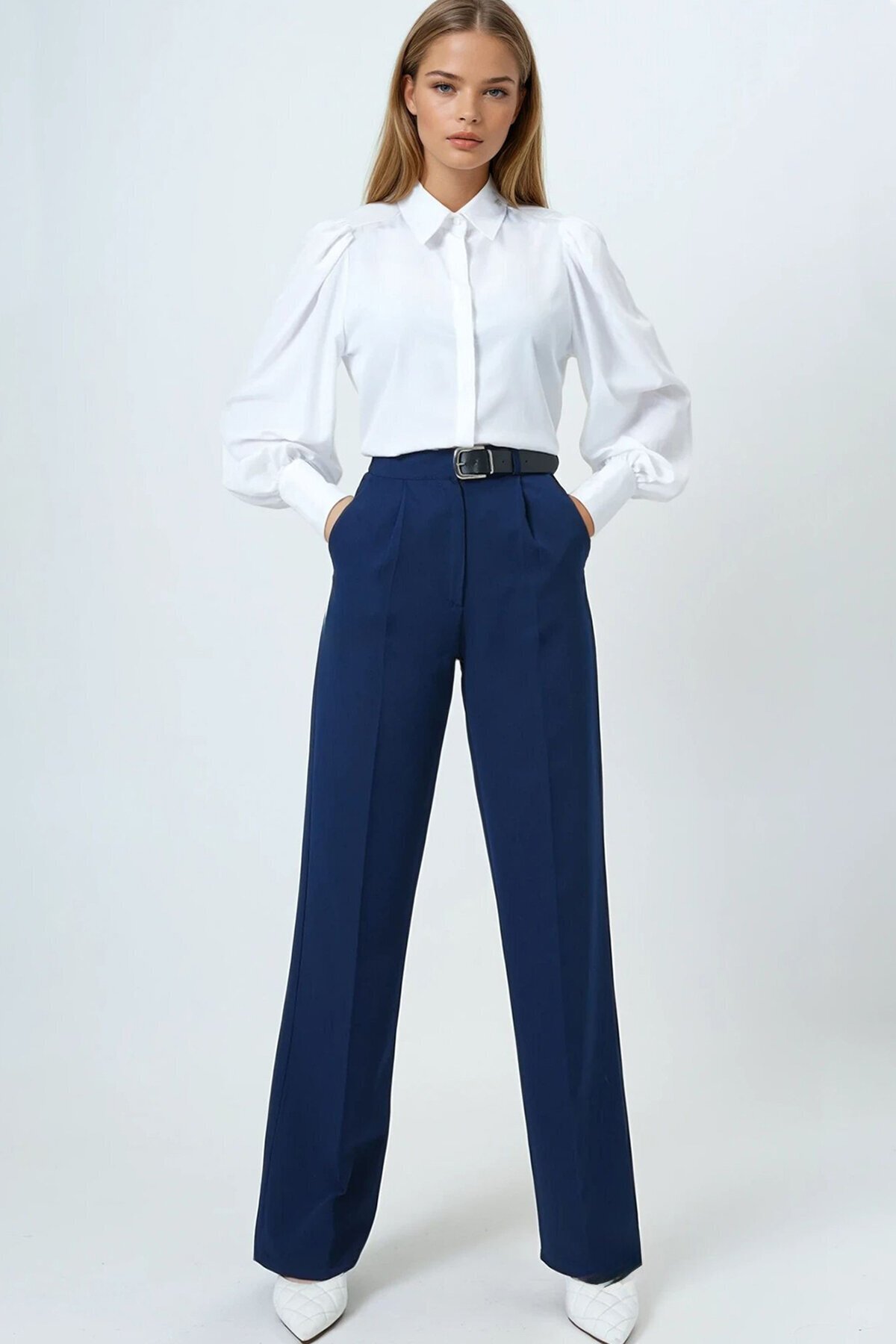 ALAÇATI STİLİ Kadın Lacivert Kemerli Düğme Kapamalı Çift Cepli Palazzo Pantolon Vs01458 ALAÇATI STİLİ Kadın Lacivert Kemerli Düğme Kapamalı Çift Cepli Palazzo Pantolon Vs01458 VS01458 46