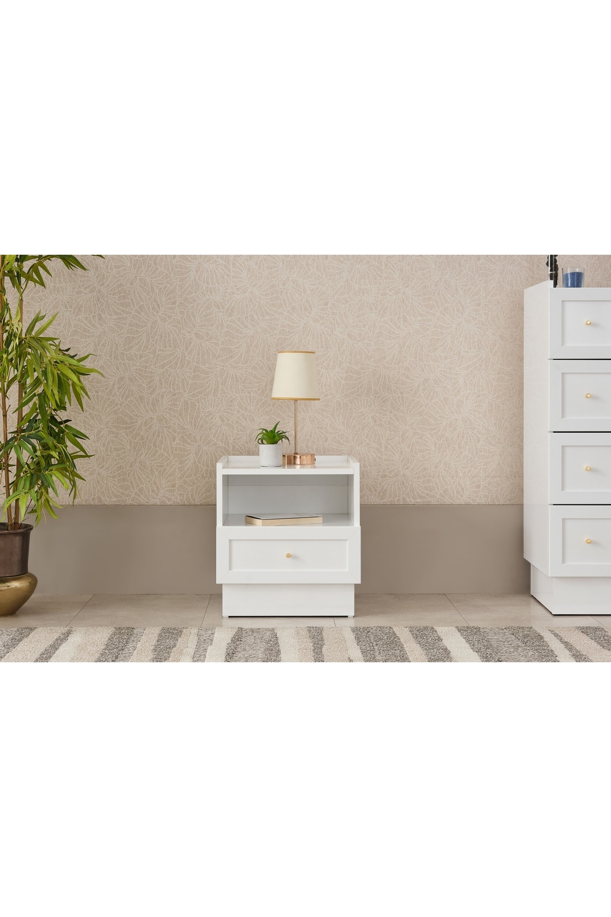 - تنظیم محتوا : کمد لباس + 2 عدد پاتختی + کمد + تختخواب پایه