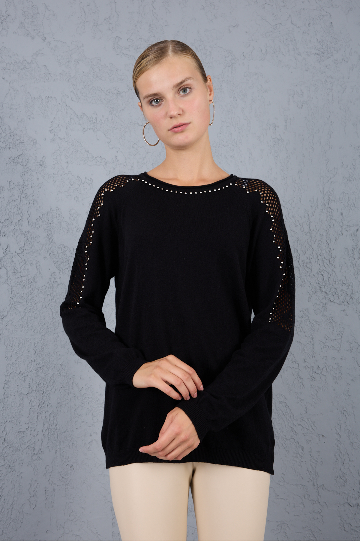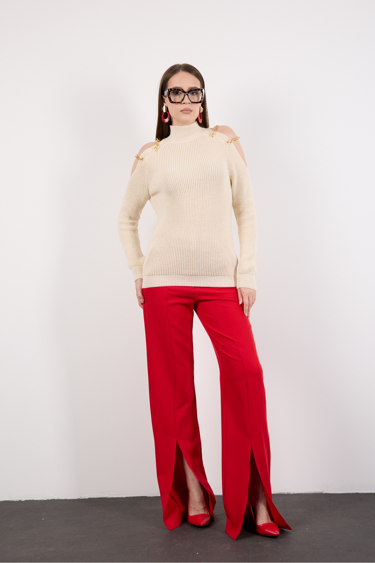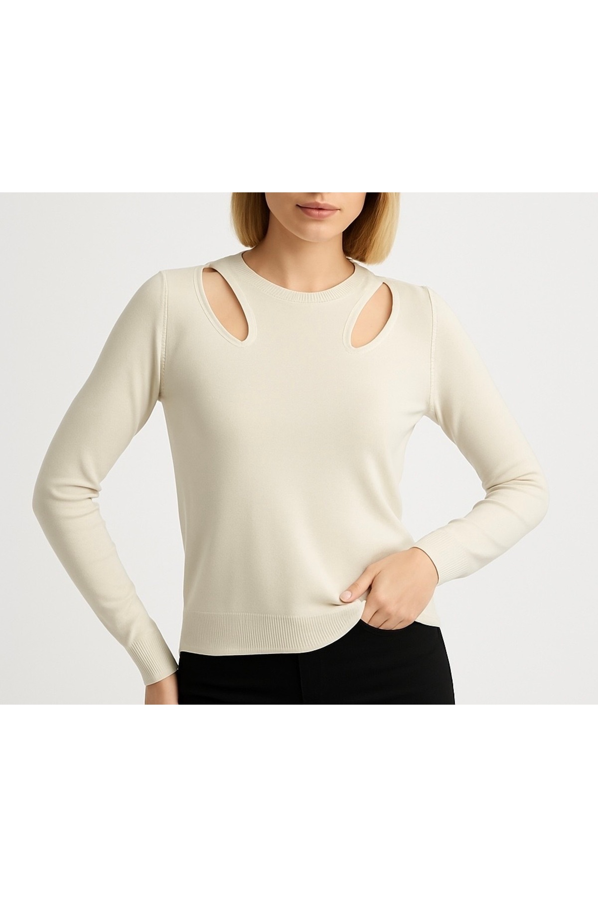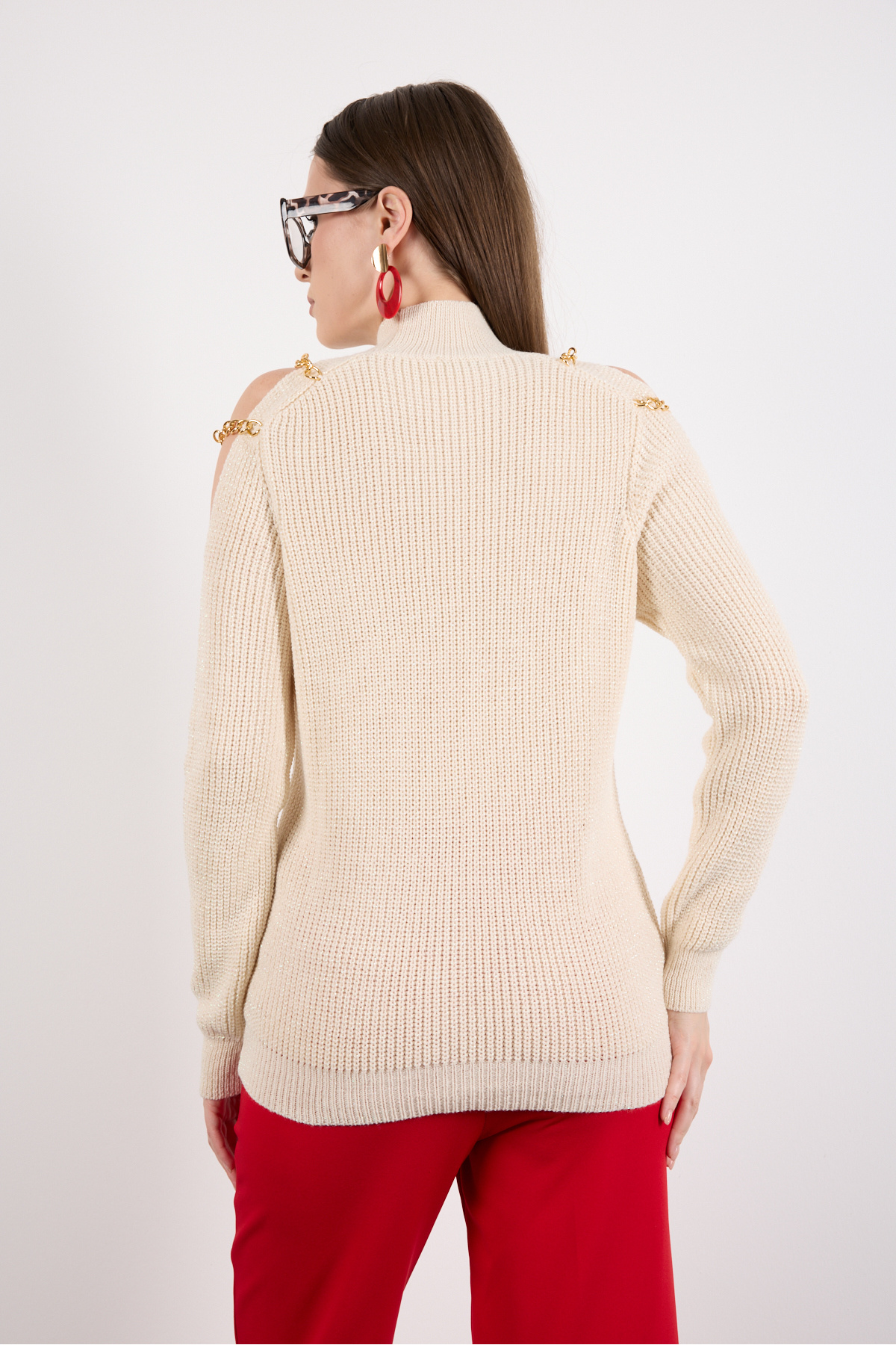 Kadın Ekru Zincir Detaylı Omuz Dekolteli Yarım Balıkçı Yaka Simli Triko Kazak Kadın Ekru Zincir Detaylı Omuz Dekolteli Yarım Balıkçı Yaka Simli Triko Kazak 11154 Standart