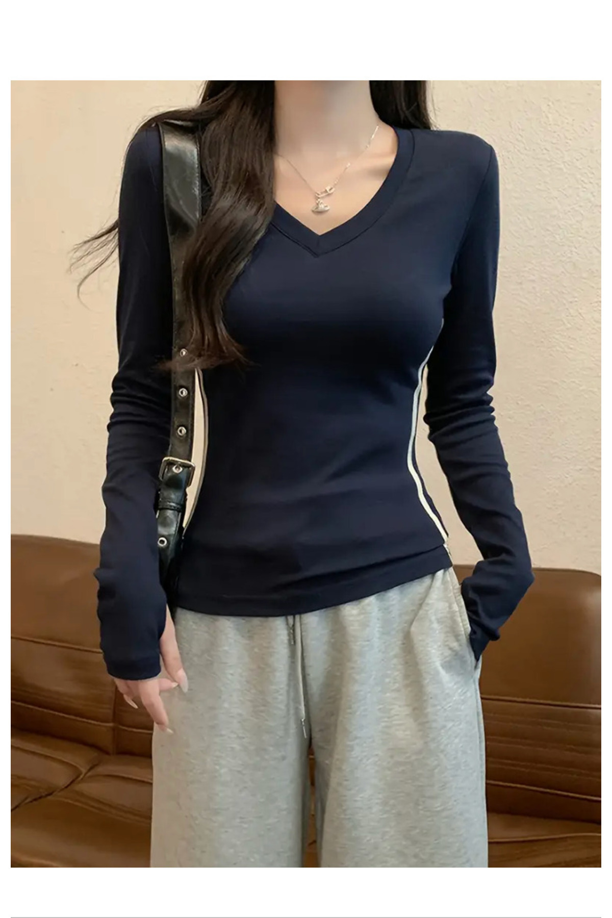 Şık V Yaka Beyaz Şeritli Lacivert Uzun Kollu Bluz Şık V Yaka Beyaz Şeritli Lacivert Uzun Kollu Bluz Peripetidhjkkk L