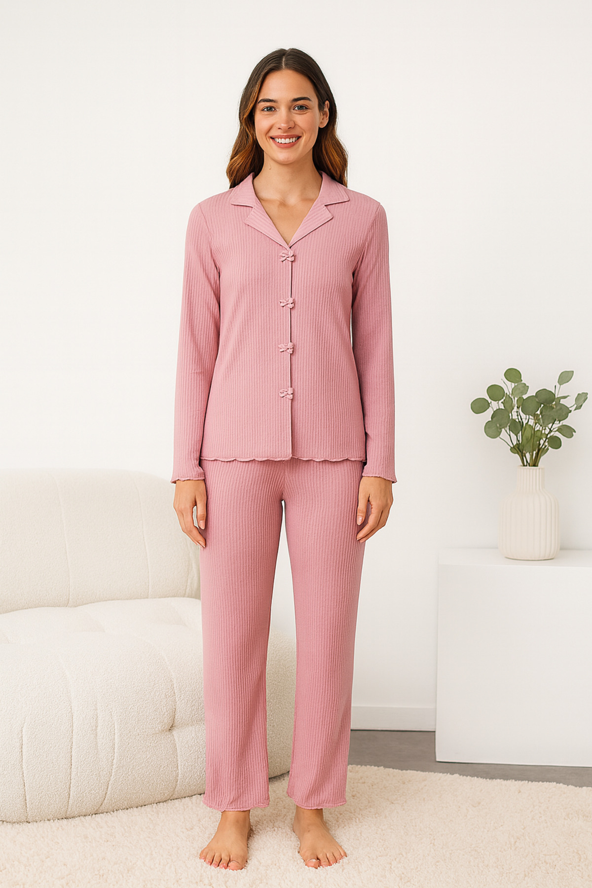 Fitilli Yumuşak Pamuklu Fiyonk Detaylı Uzun Kollu Kadın Pijama Takımı Fitilli Yumuşak Pamuklu Fiyonk Detaylı Uzun Kollu Kadın Pijama Takımı 5906 2XL