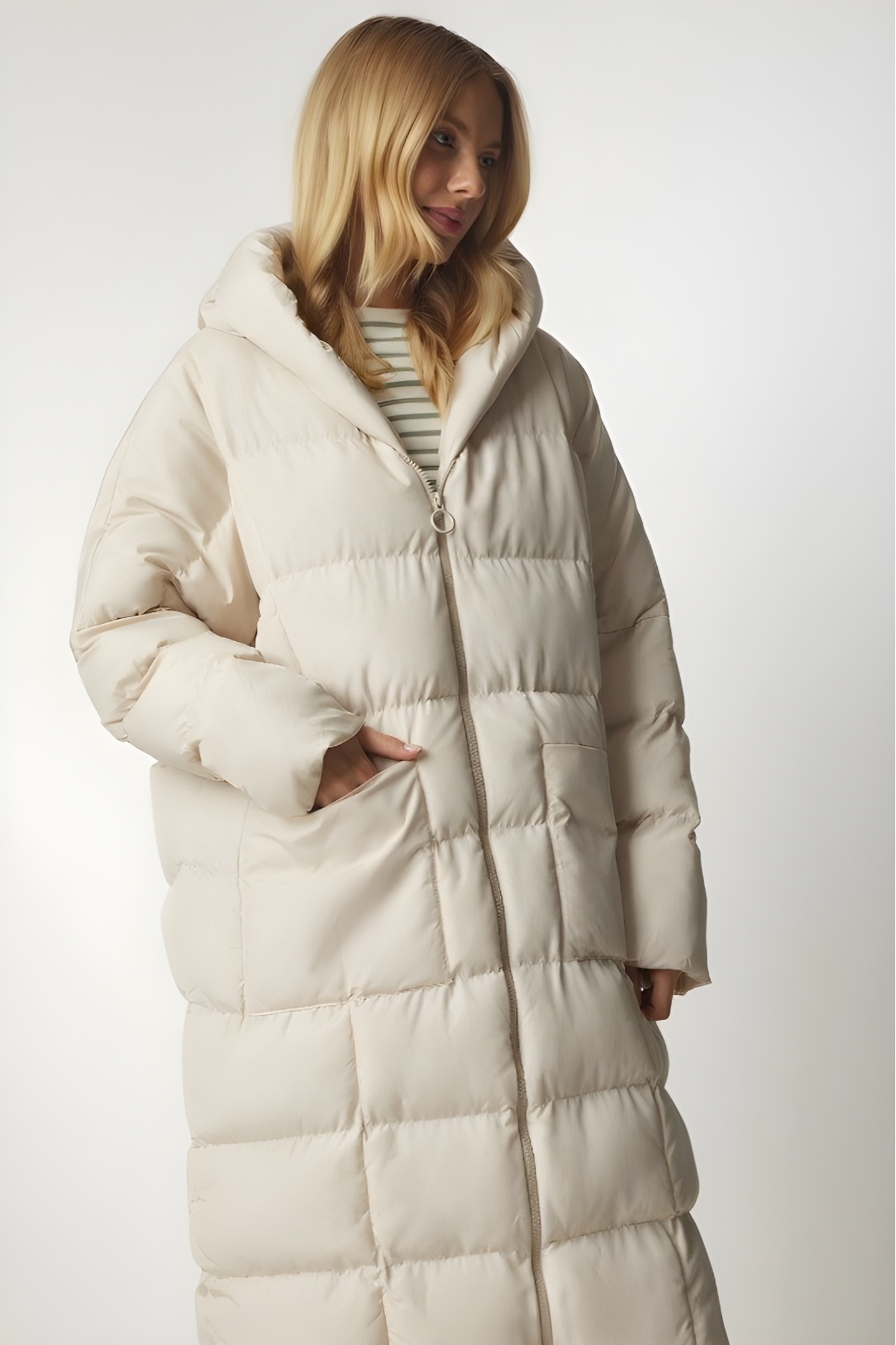 Kadın Oversize Uzun Kapüşonlu Şişme Mont – Bej Kadın Oversize Uzun Kapüşonlu Şişme Mont – Bej FS21 XL