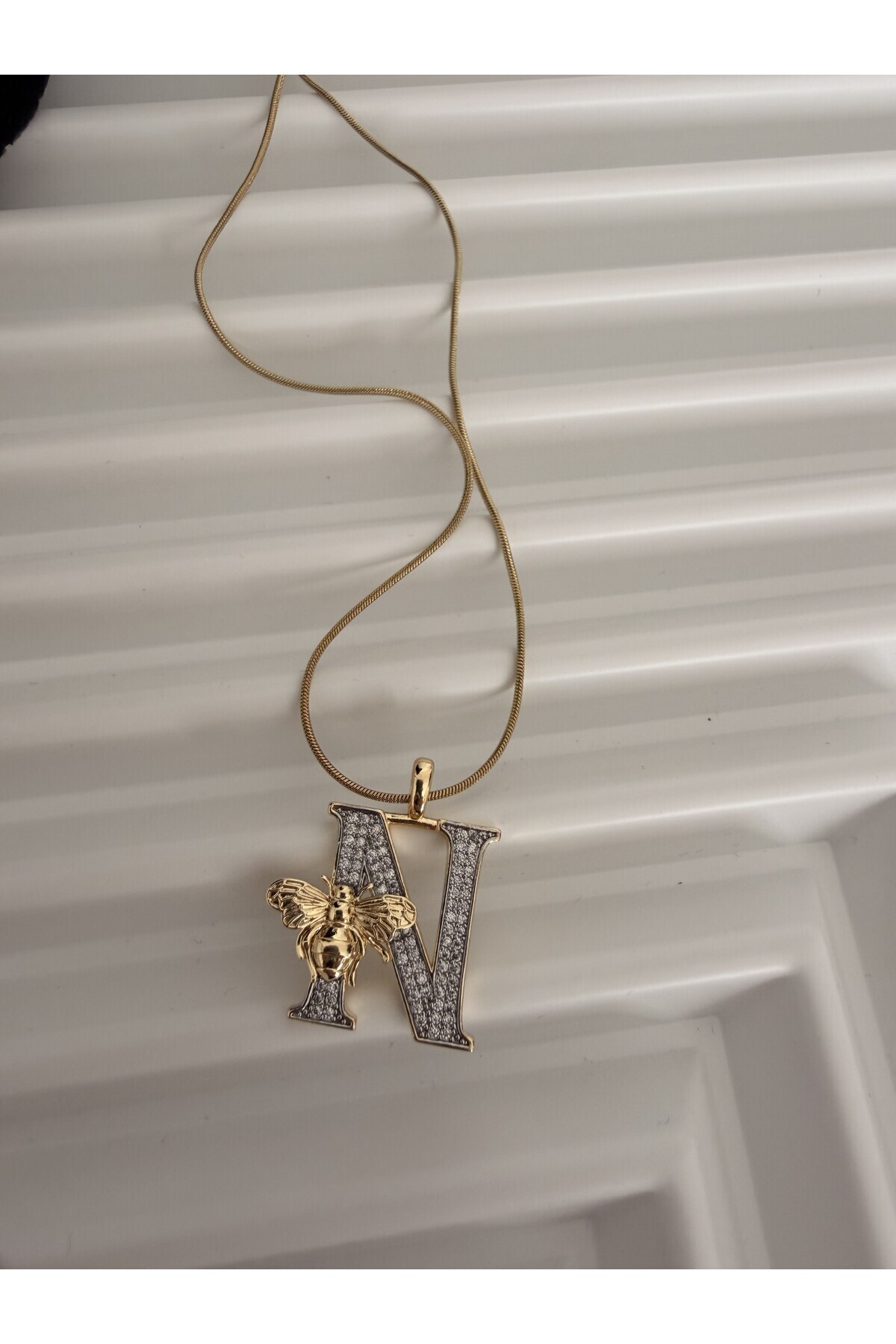 ZİRKON TAŞLI,GOLD RENK, ARI DETAYLI, ŞIK TASARIM ÇELİK HARF KOLYE ZİRKON TAŞLI,GOLD RENK, ARI DETAYLI, ŞIK TASARIM ÇELİK HARF KOLYE HARFARI 40-45