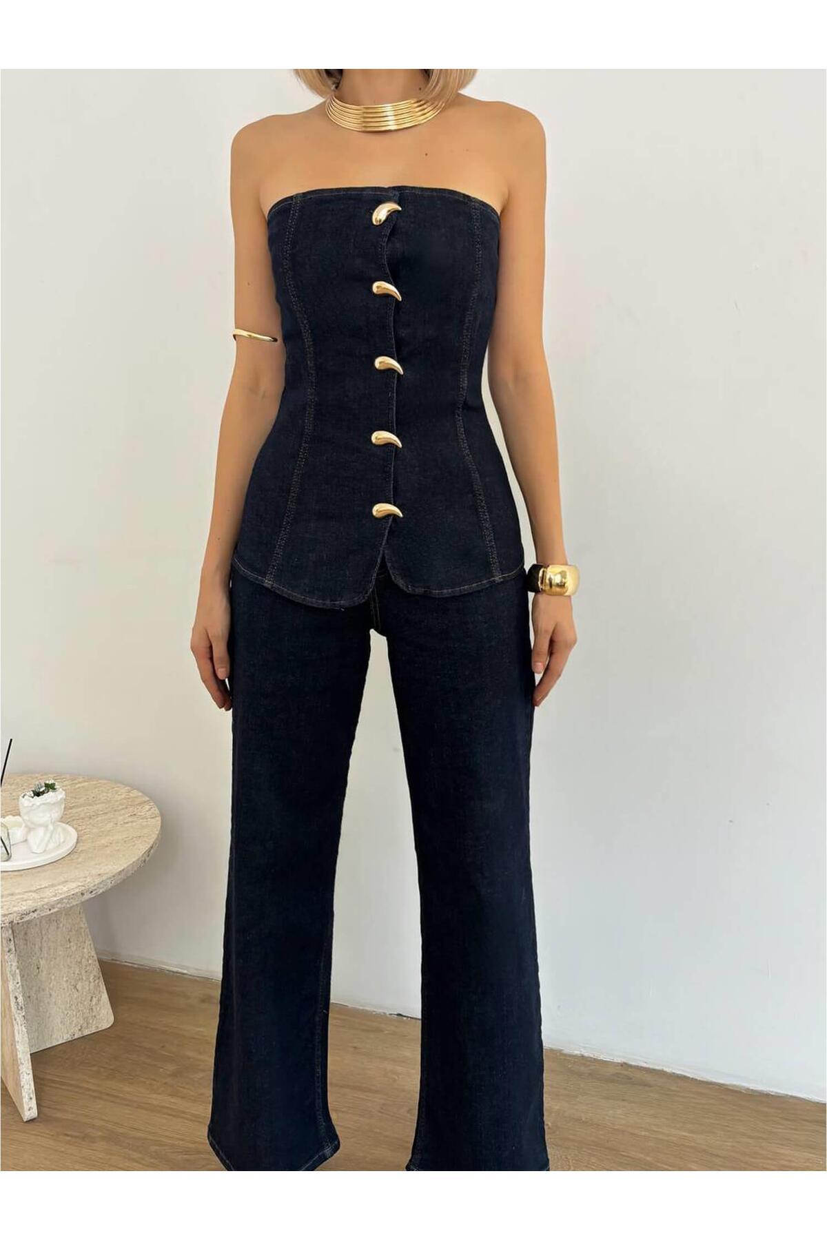 Damla Düğmeli Straplez Bluzlu Kot Takım 30019 Lacivert Damla Düğmeli Straplez Bluzlu Kot Takım 30019 Lacivert W25W-MCX-00080 XL