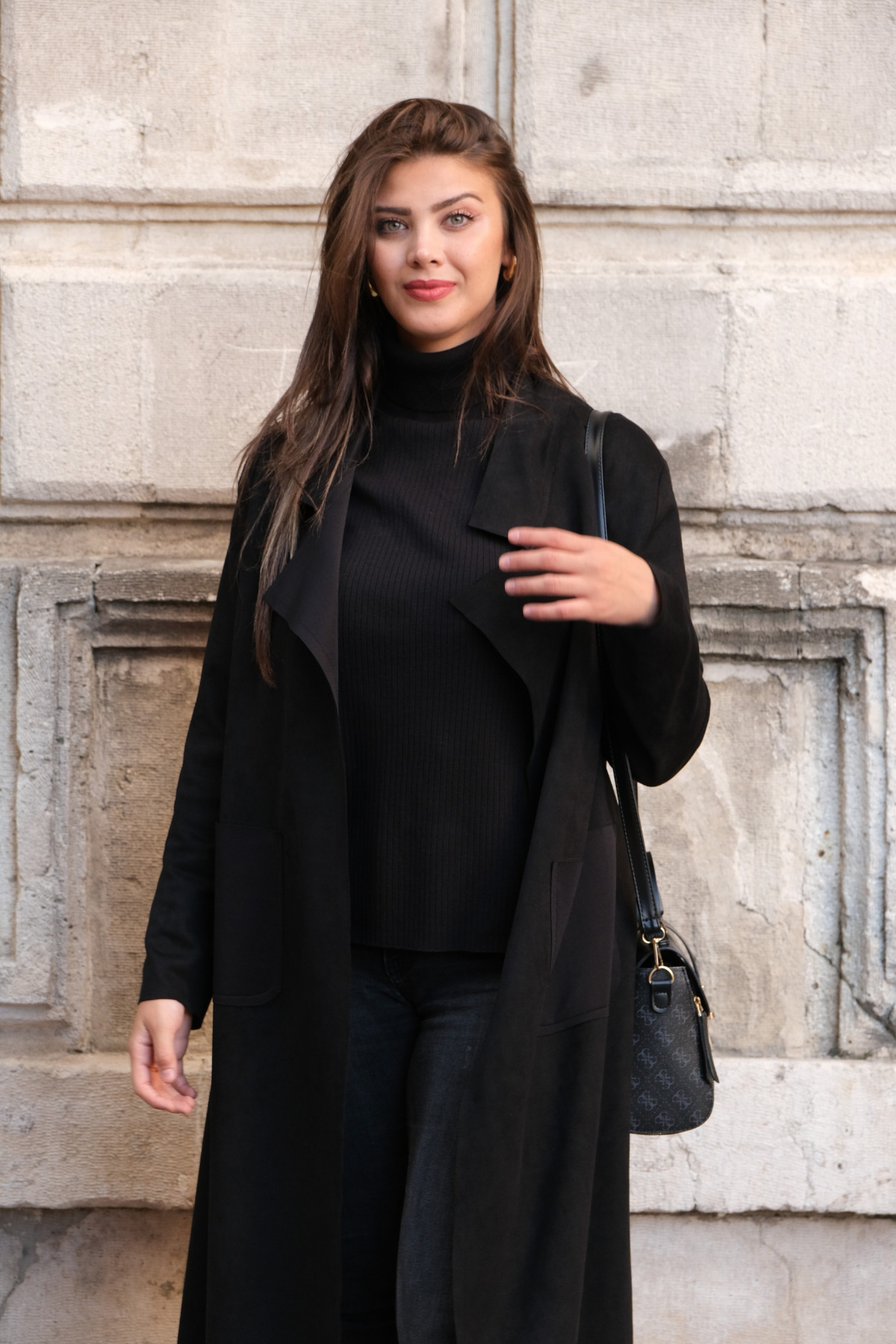 Kadın Siyah Uzun Süvet Ceket – Salaş Kesim, Sade Mevsimlik Dış Giyim Kadın Siyah Uzun Süvet Ceket – Salaş Kesim, Sade Mevsimlik Dış Giyim KSM2025 46