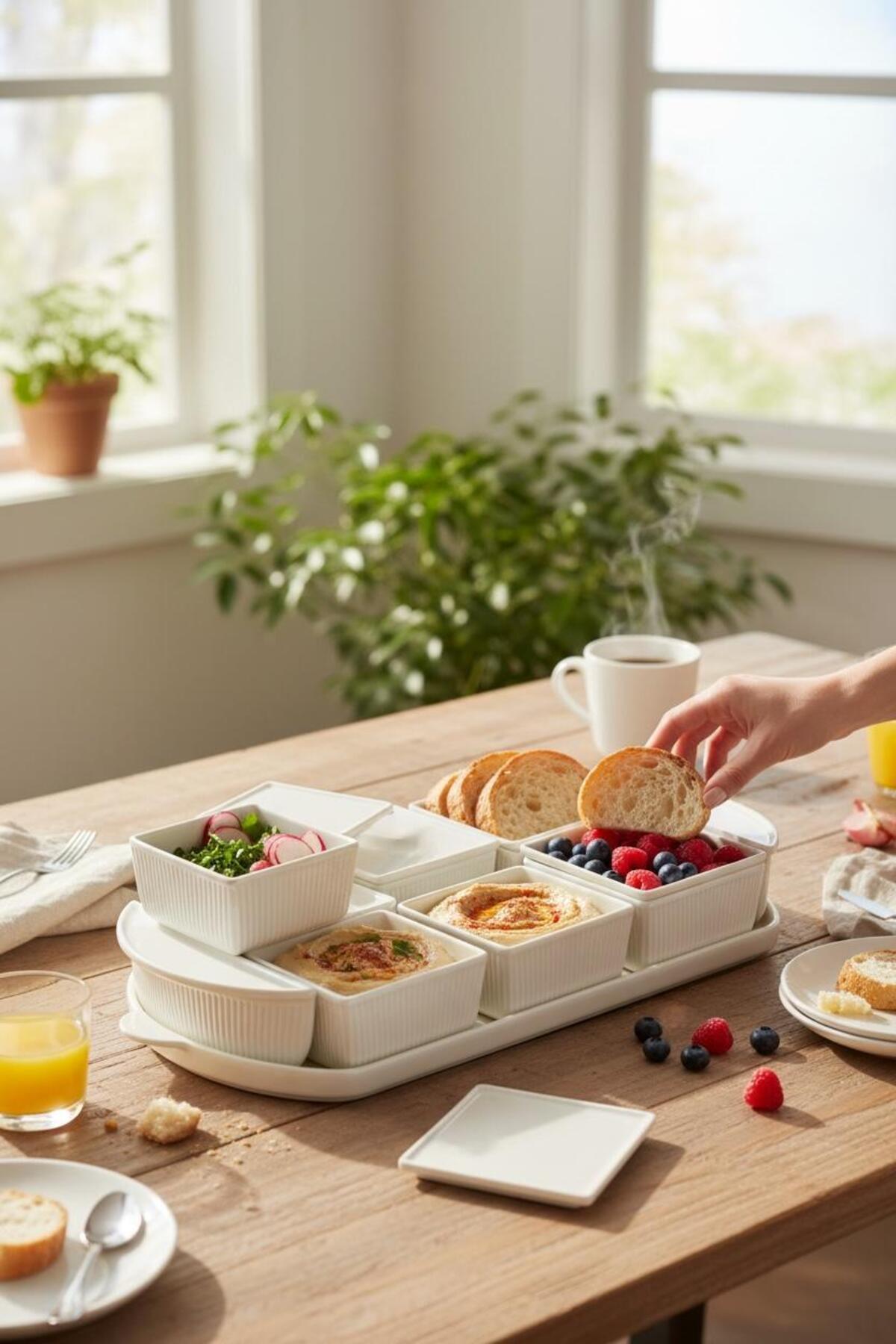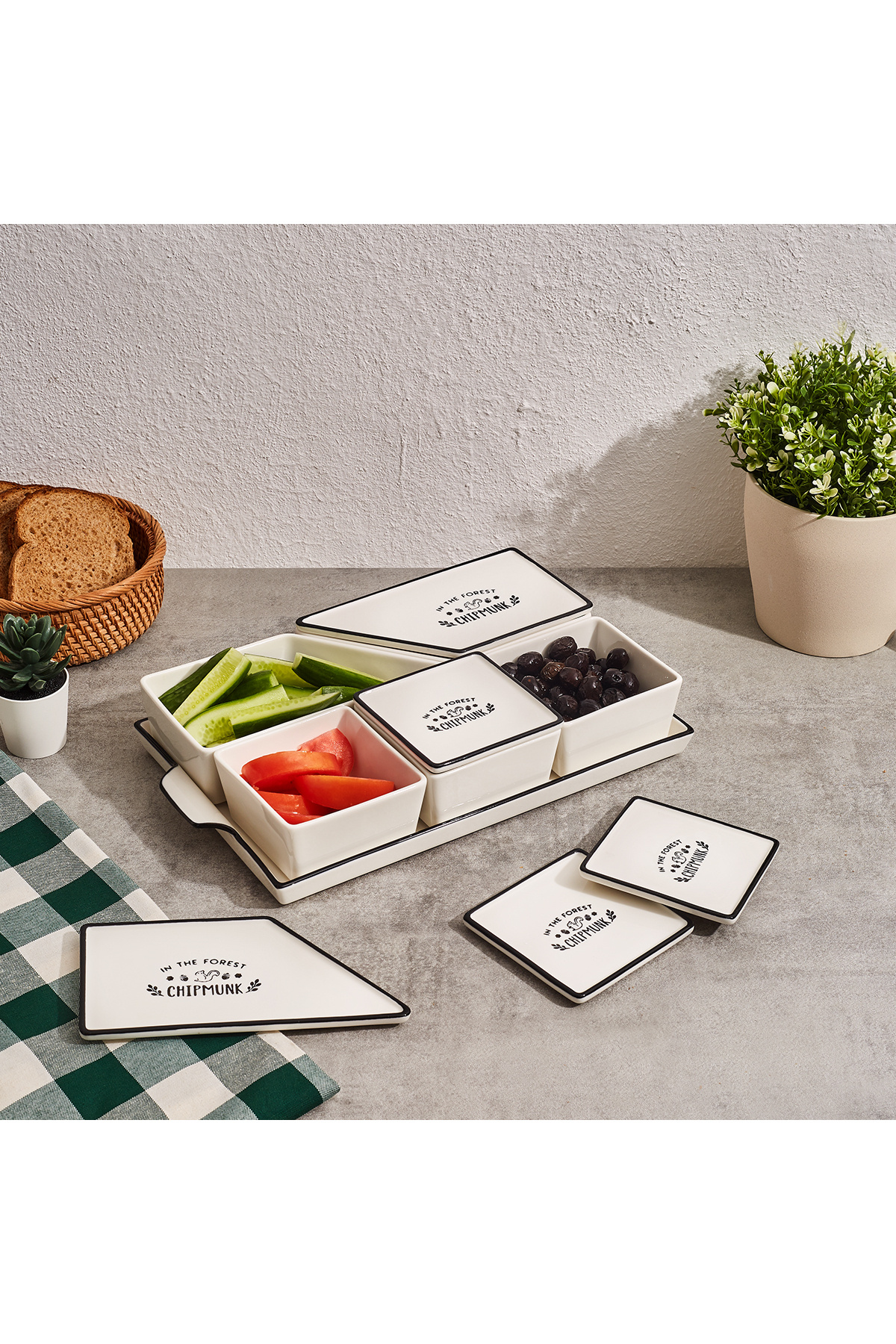Porselen Oval Tepsili 6 Bölmeli Kapaklı Kahvaltılık Sunum Seti Porselen Oval Tepsili 6 Bölmeli Kapaklı Kahvaltılık Sunum Seti EV-005 تک سایز