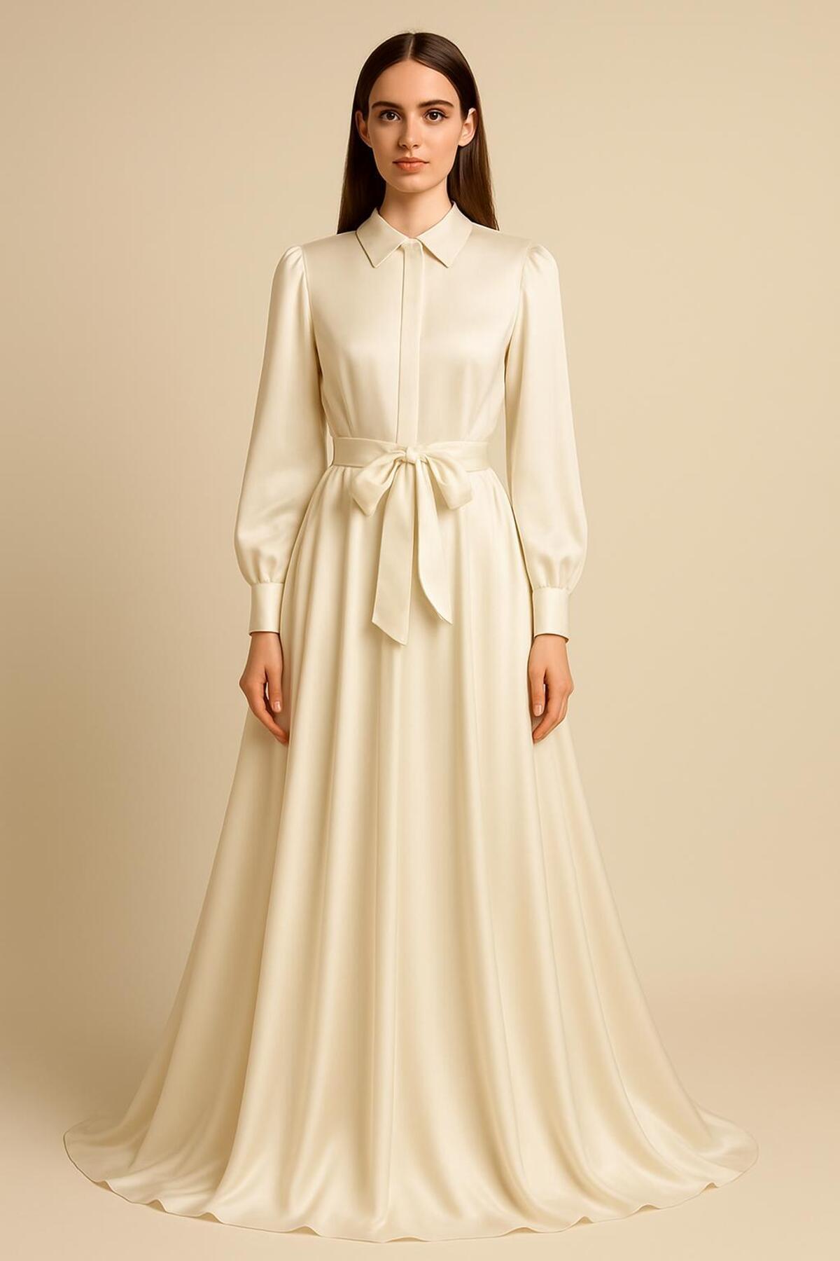 Ekru Maxi Boy Şık Tafta Gömlek Elbise Ekru Maxi Boy Şık Tafta Gömlek Elbise ANY-094 50