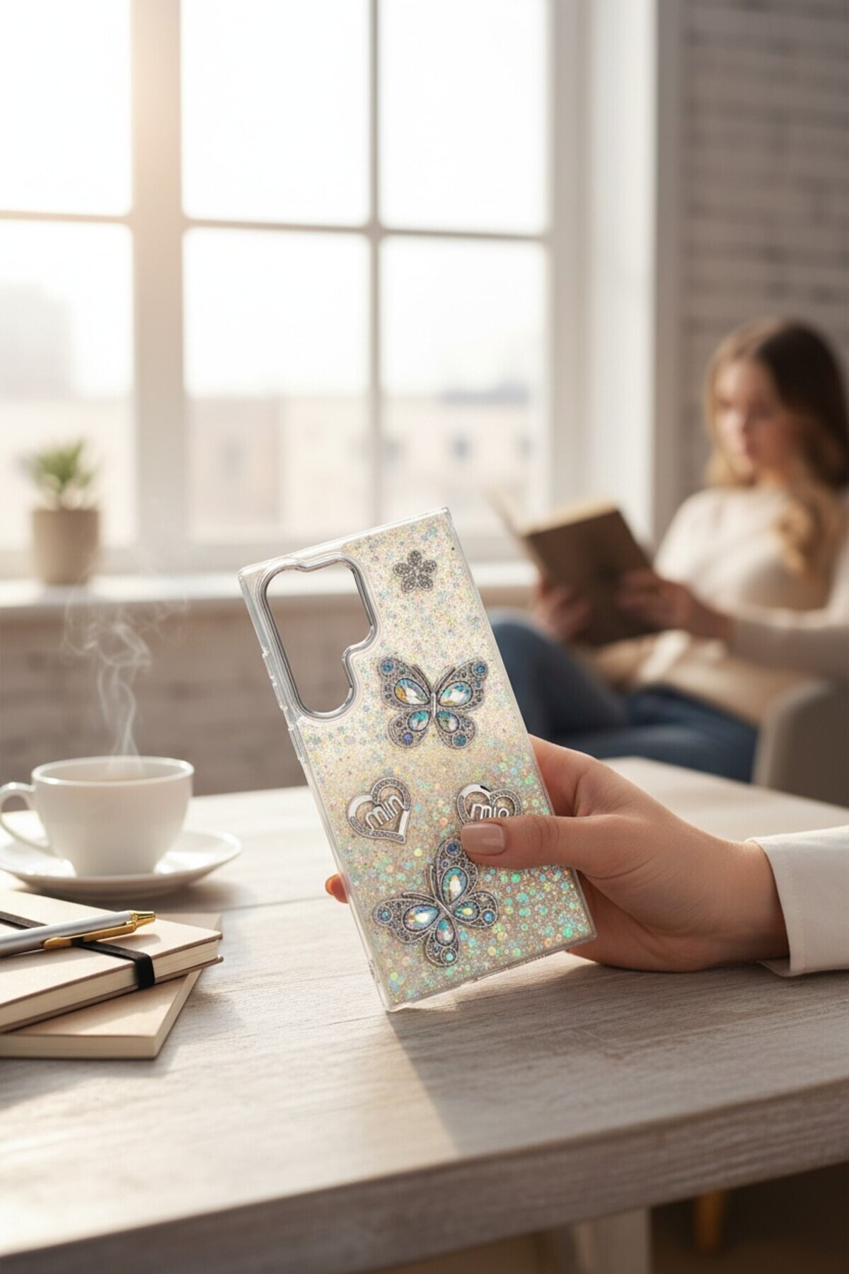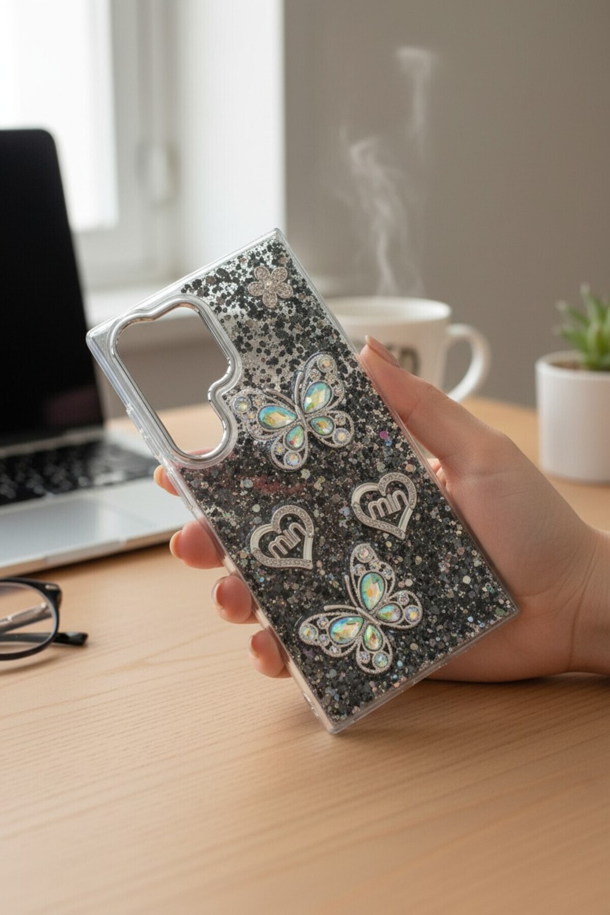 Samsung Galaxy S24 Ultra Kelebek ve Kalp Kabartmalı Simli Taşlı TDM Şeffaf Silikon Kapak Samsung Galaxy S24 Ultra Kelebek ve Kalp Kabartmalı Simli Taşlı TDM Şeffaf Silikon Kapak 546g5645g645645 تک سایز