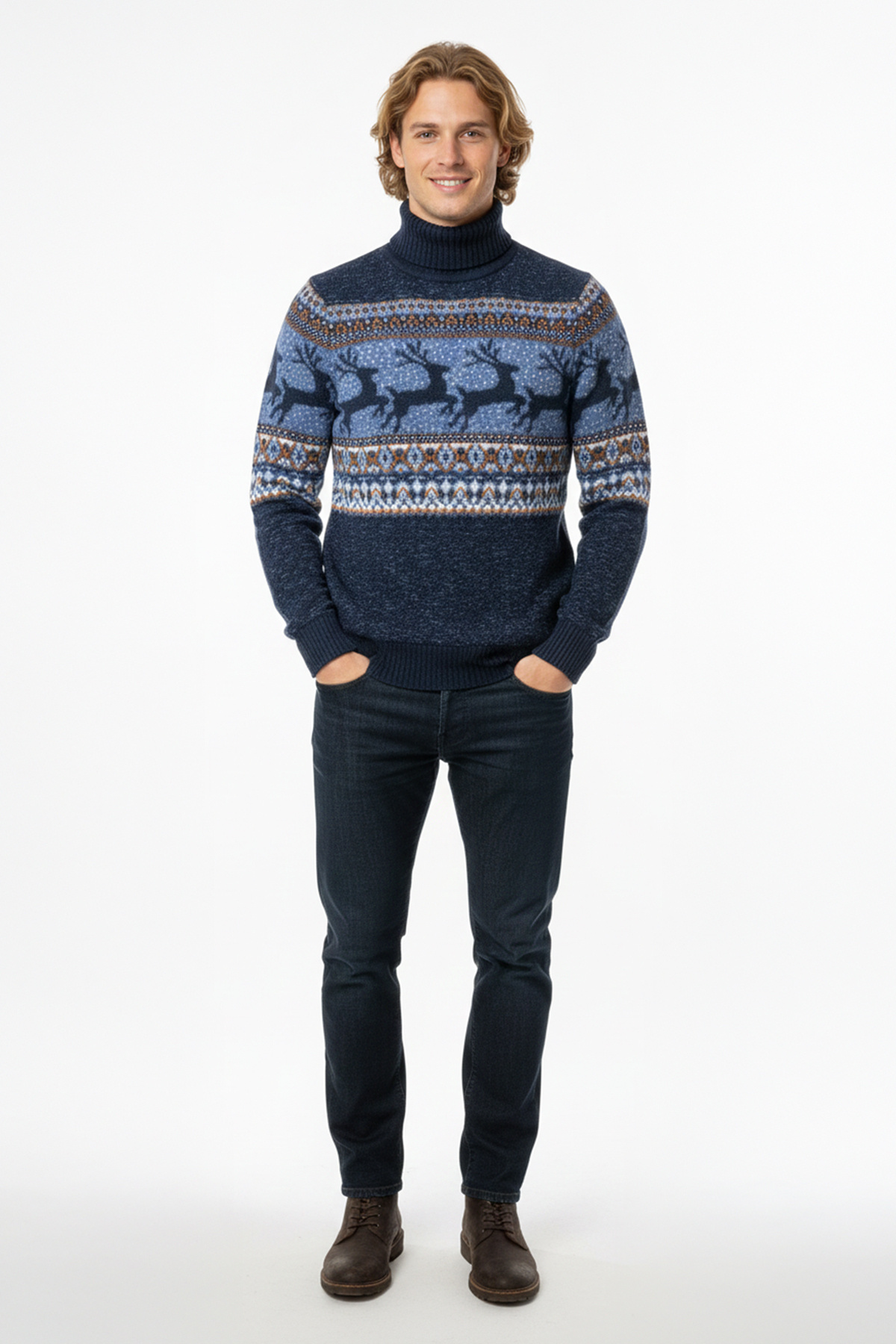 Erkek Balıkçı Yaka Geyik Desenli Yılbaşı Konseptli Kazak Erkek Balıkçı Yaka Geyik Desenli Yılbaşı Konseptli Kazak T230-580 XL