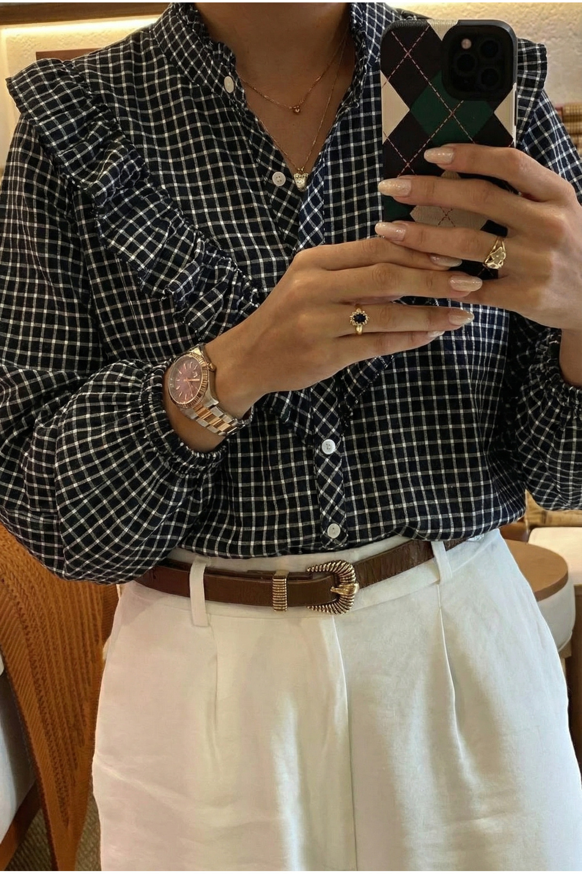 Kadın Siyah Çizgili Dik Yaka Fırfırlı Pamuklu Gömlek Kadın Siyah Çizgili Dik Yaka Fırfırlı Pamuklu Gömlek 6226 L