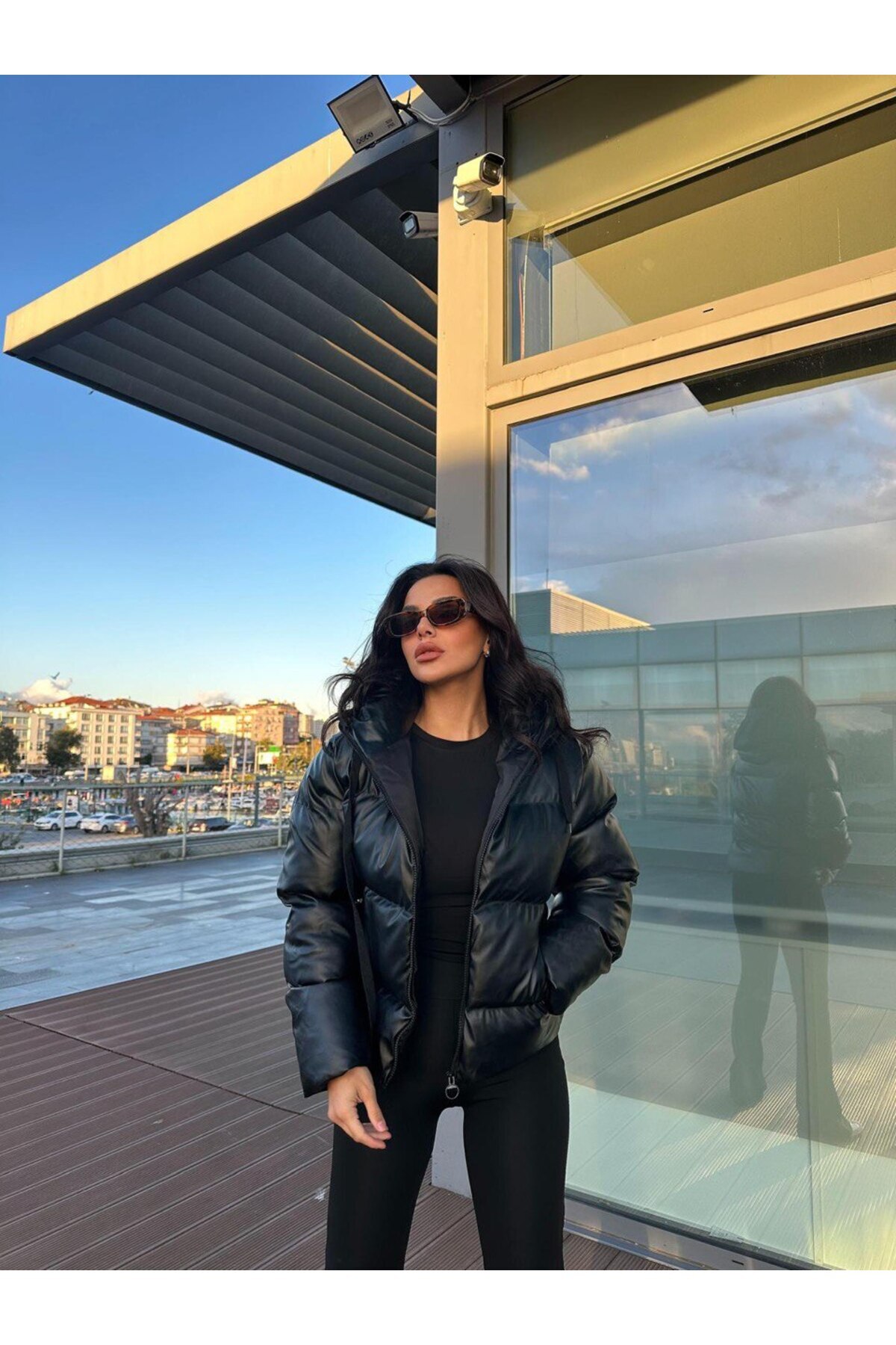 Kapüşonlu Crop Kısa Şişme Deri Mont Kapüşonlu Crop Kısa Şişme Deri Mont bqr-000141 L