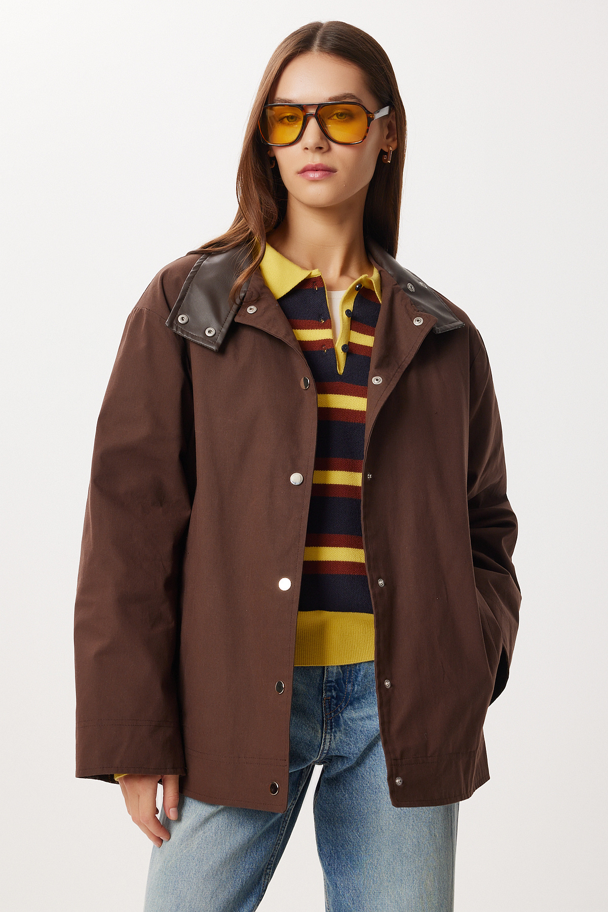 Kontrast Deri Yaka Detaylı Gabardin Ceket LFN0139 KAHVERENGİ Kontrast Deri Yaka Detaylı Gabardin Ceket LFN0139 KAHVERENGİ 40