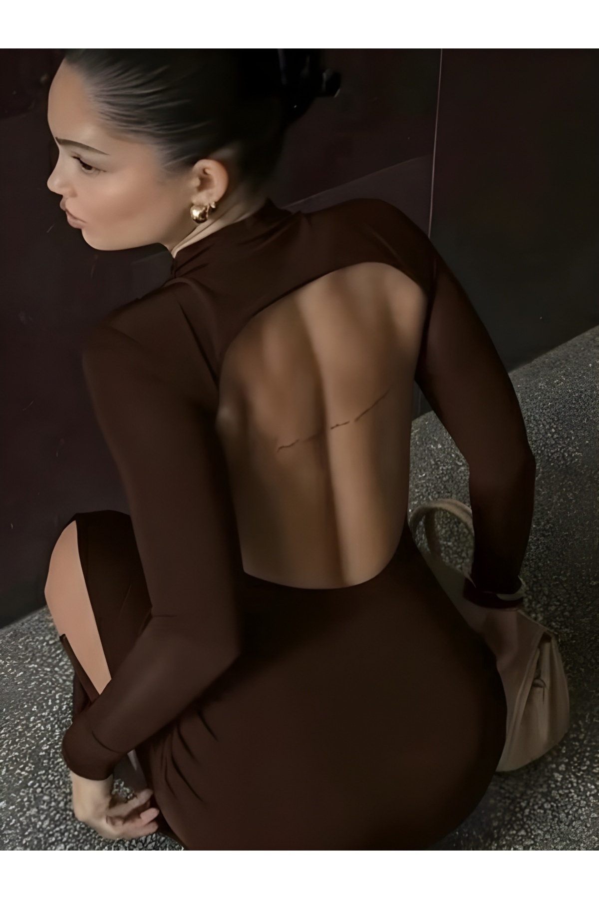 Sırt Dekolteli Dik Yaka Yırtmaçlı Likralı Uzun Kollu Elbise Sırt Dekolteli Dik Yaka Yırtmaçlı Likralı Uzun Kollu Elbise SIRT-DEKOLTE- L