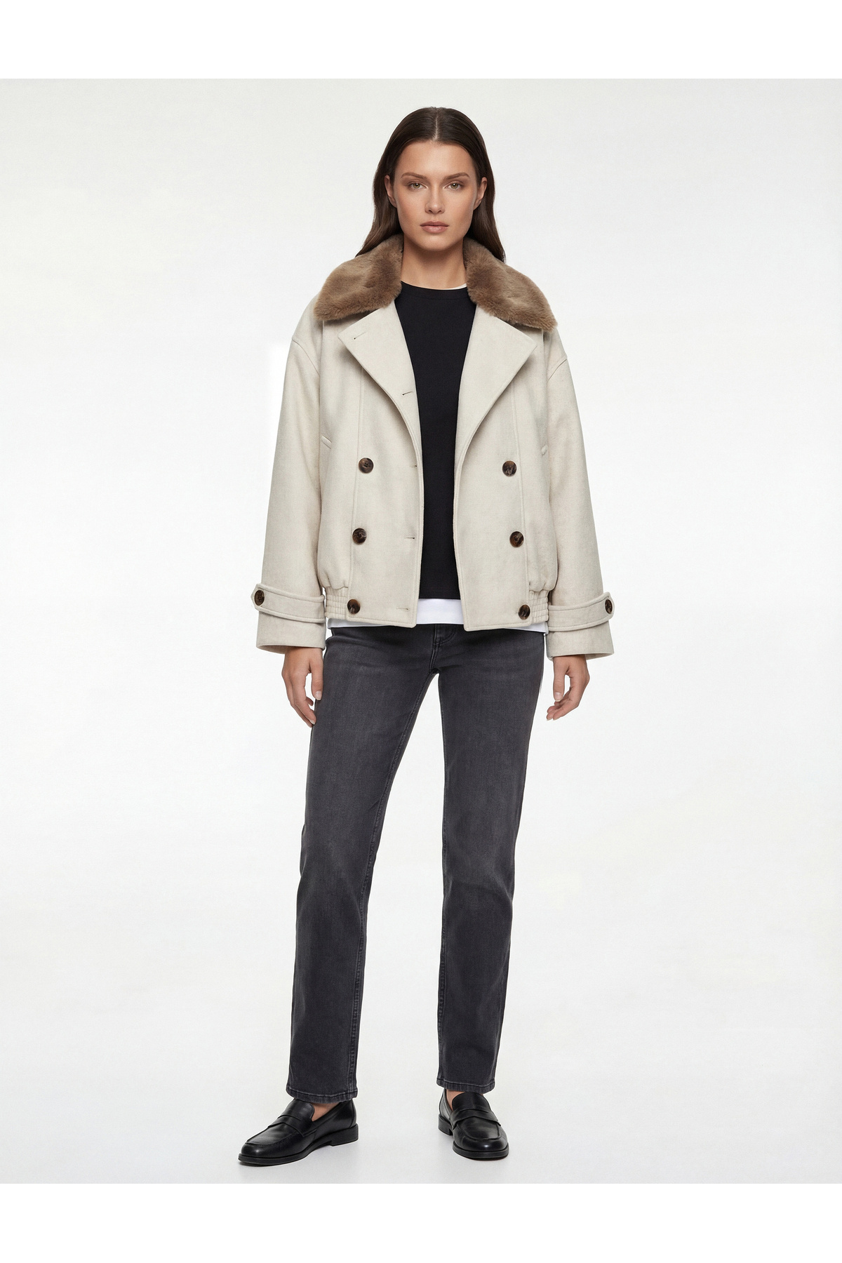Kısa Kaban Kaşe Dik Yaka Fermuarlı Cepli Kısa Kaban Kaşe Dik Yaka Fermuarlı Cepli 6WAK20369EW 44
