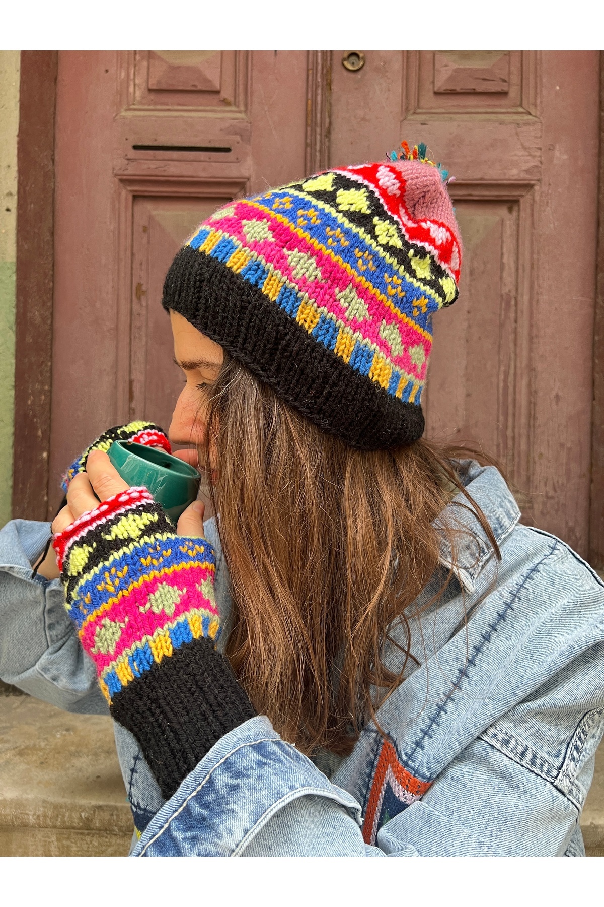 Bohem Desenli, Ponponlu Bere ve Yarım Parmak Eldiven 2'li Kışlık El Örgüsü Set Bohem Desenli, Ponponlu Bere ve Yarım Parmak Eldiven 2'li Kışlık El Örgüsü Set 5198156156165 Standart