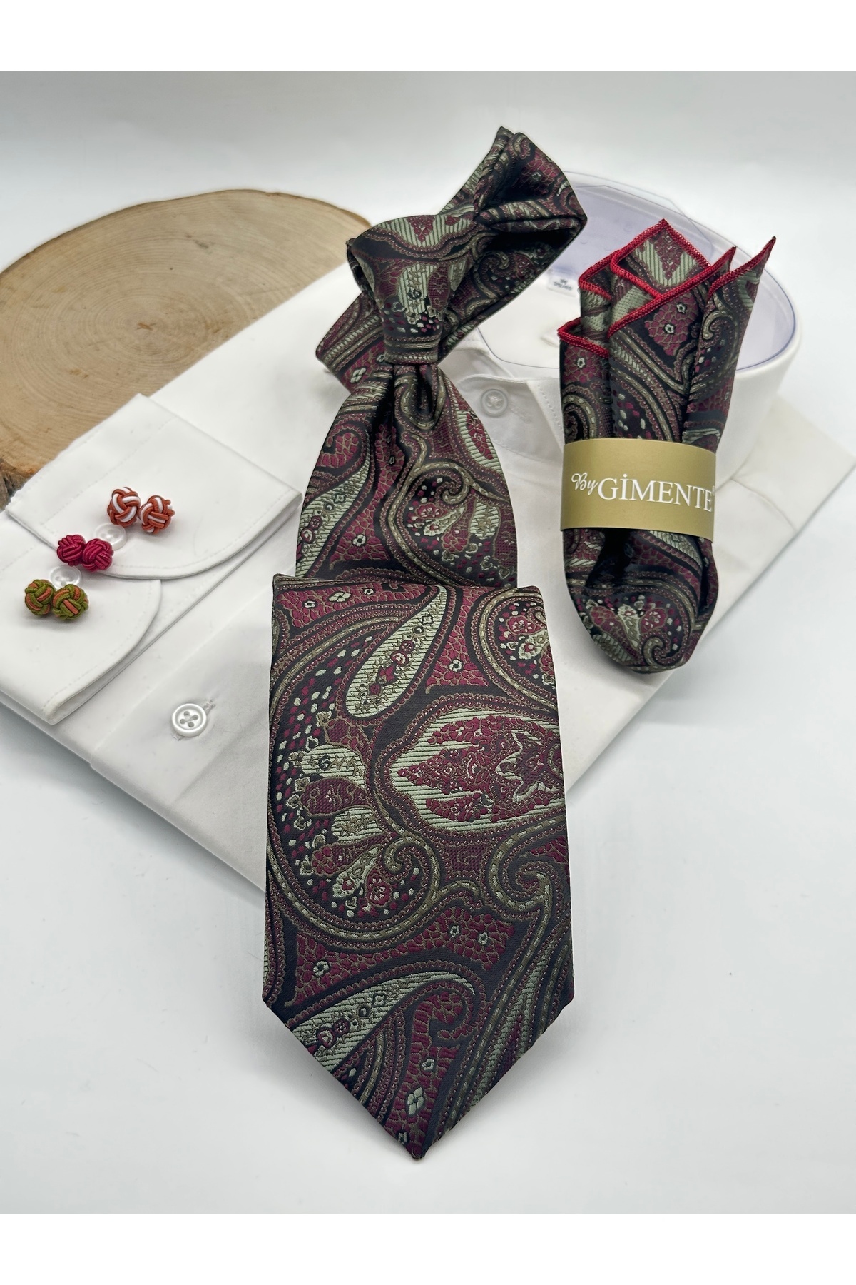 Kırmızı Şal Desenli Mendilli Klasik Kravat Kırmızı Şal Desenli Mendilli Klasik Kravat KK7-664 تک سایز