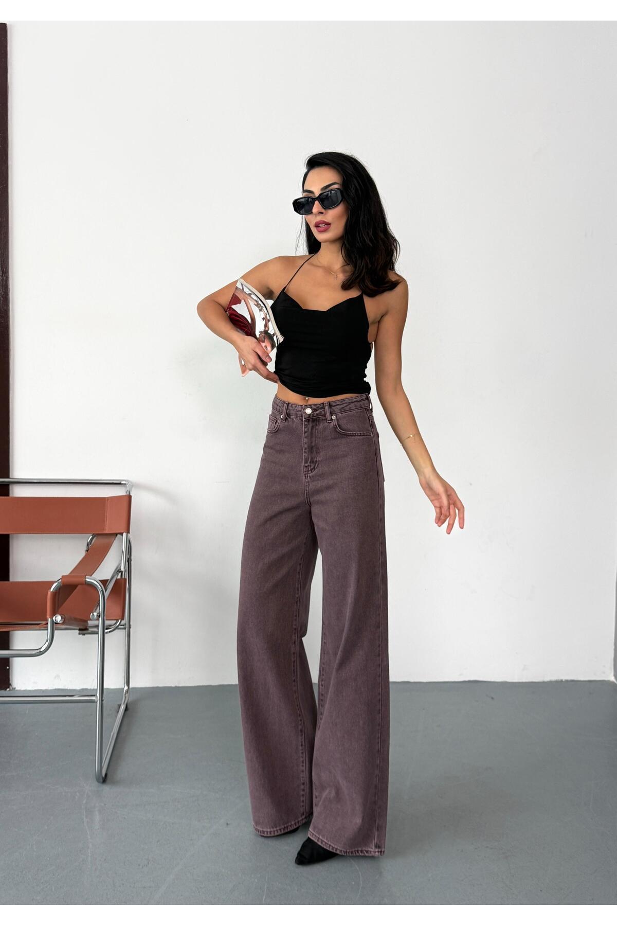 Kadın Kahverengi Ön cepli Wide-Leg Jean yüksek bel geniş paça kot pantolon Kadın Kahverengi Ön cepli Wide-Leg Jean yüksek bel geniş paça kot pantolon MAYORCA 44