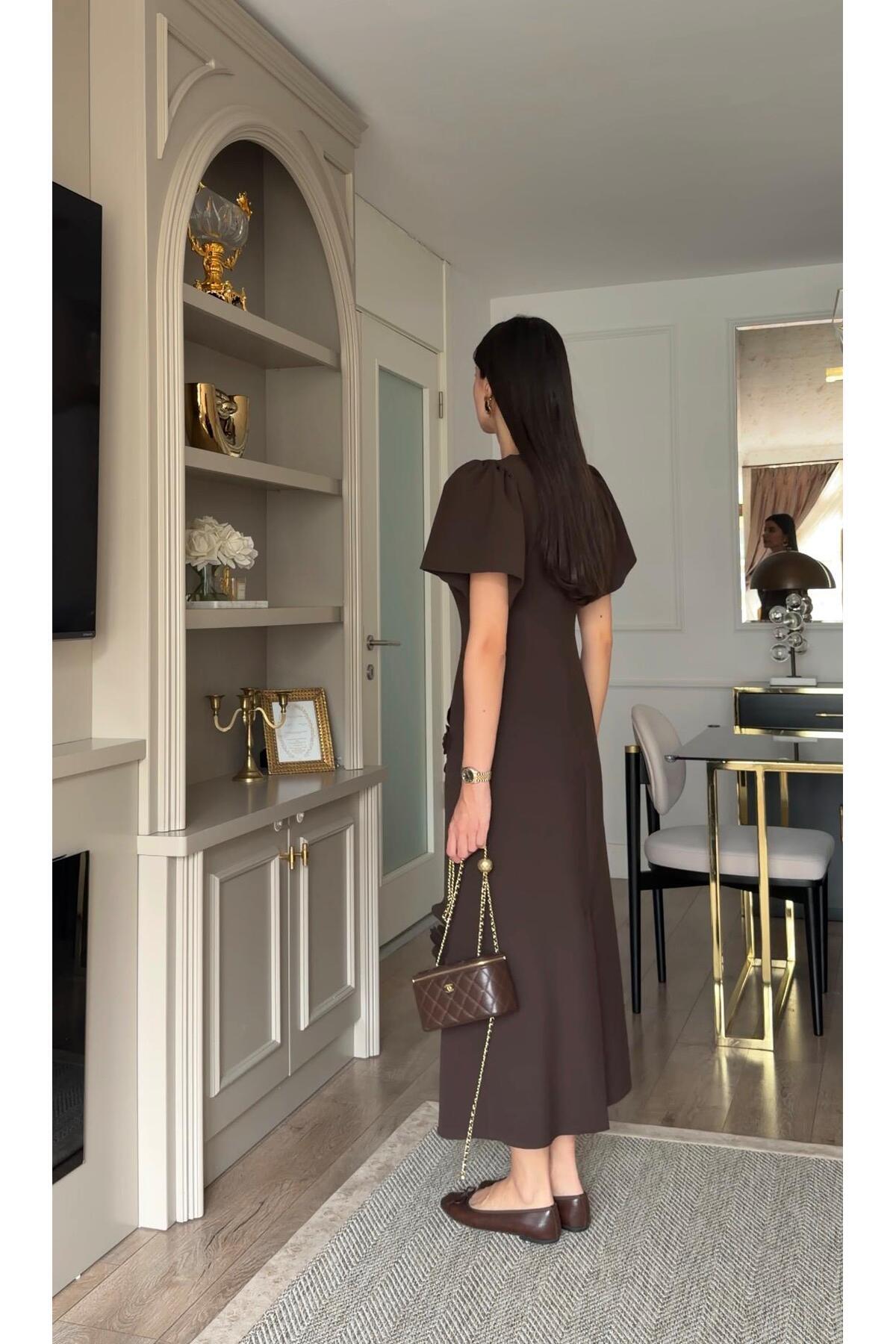 Çiçek Detaylı Kahverengi Elbise Çiçek Detaylı Kahverengi Elbise 12565 XL
