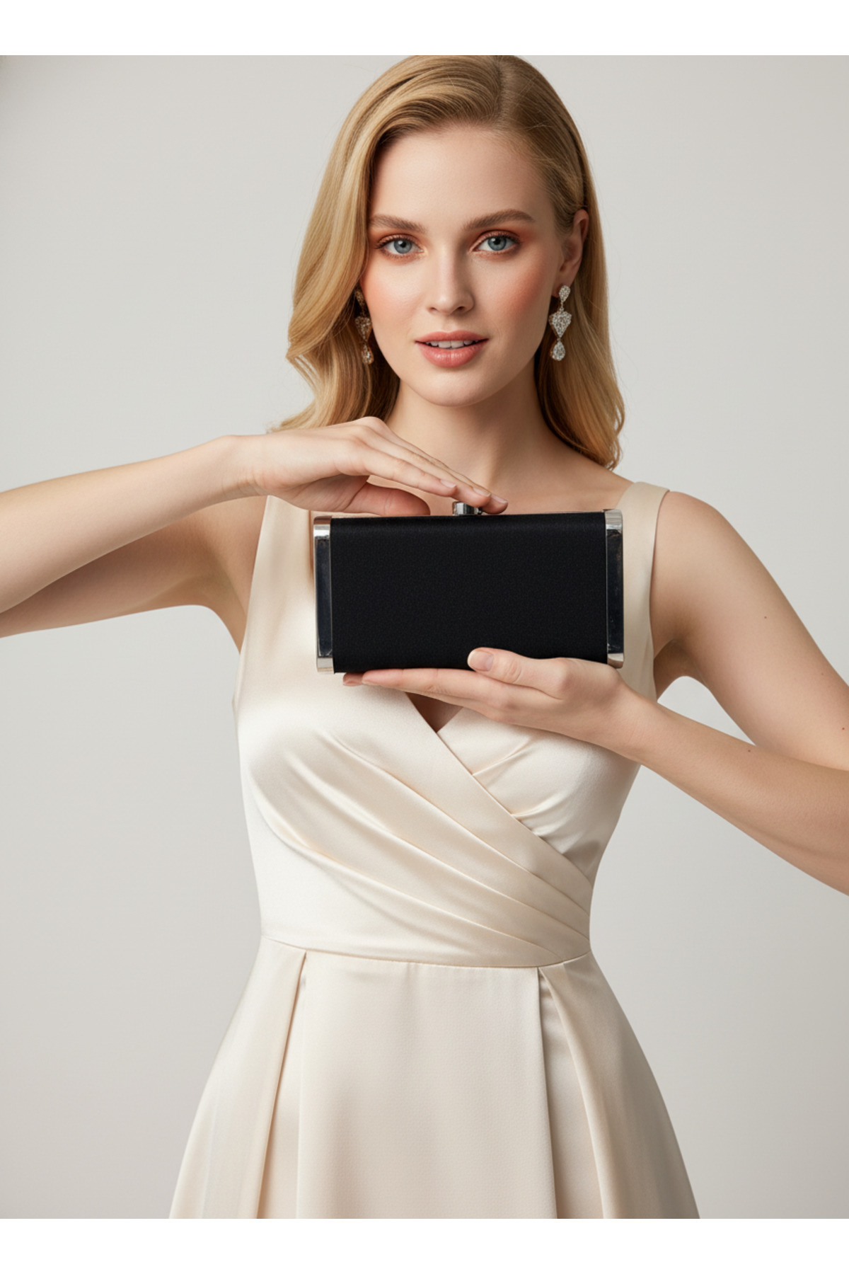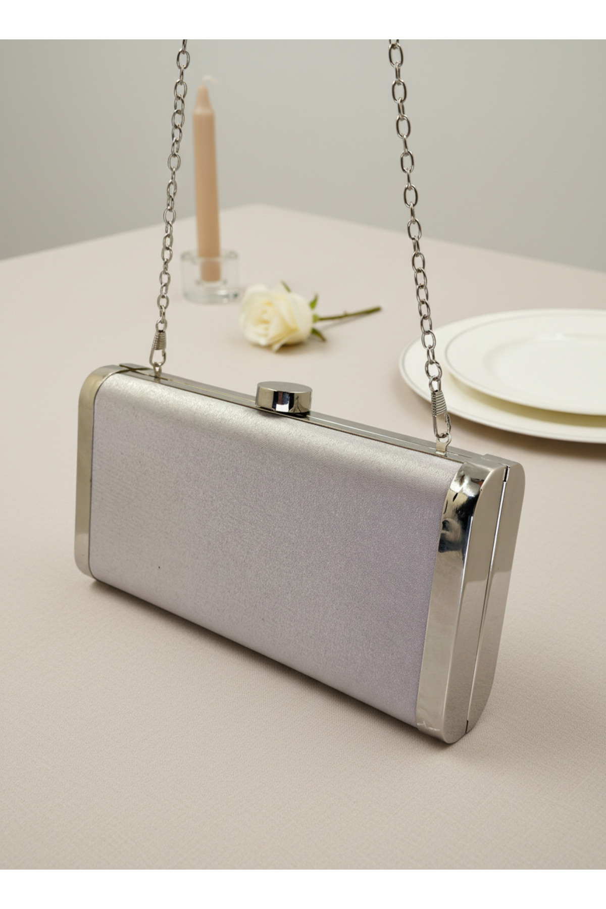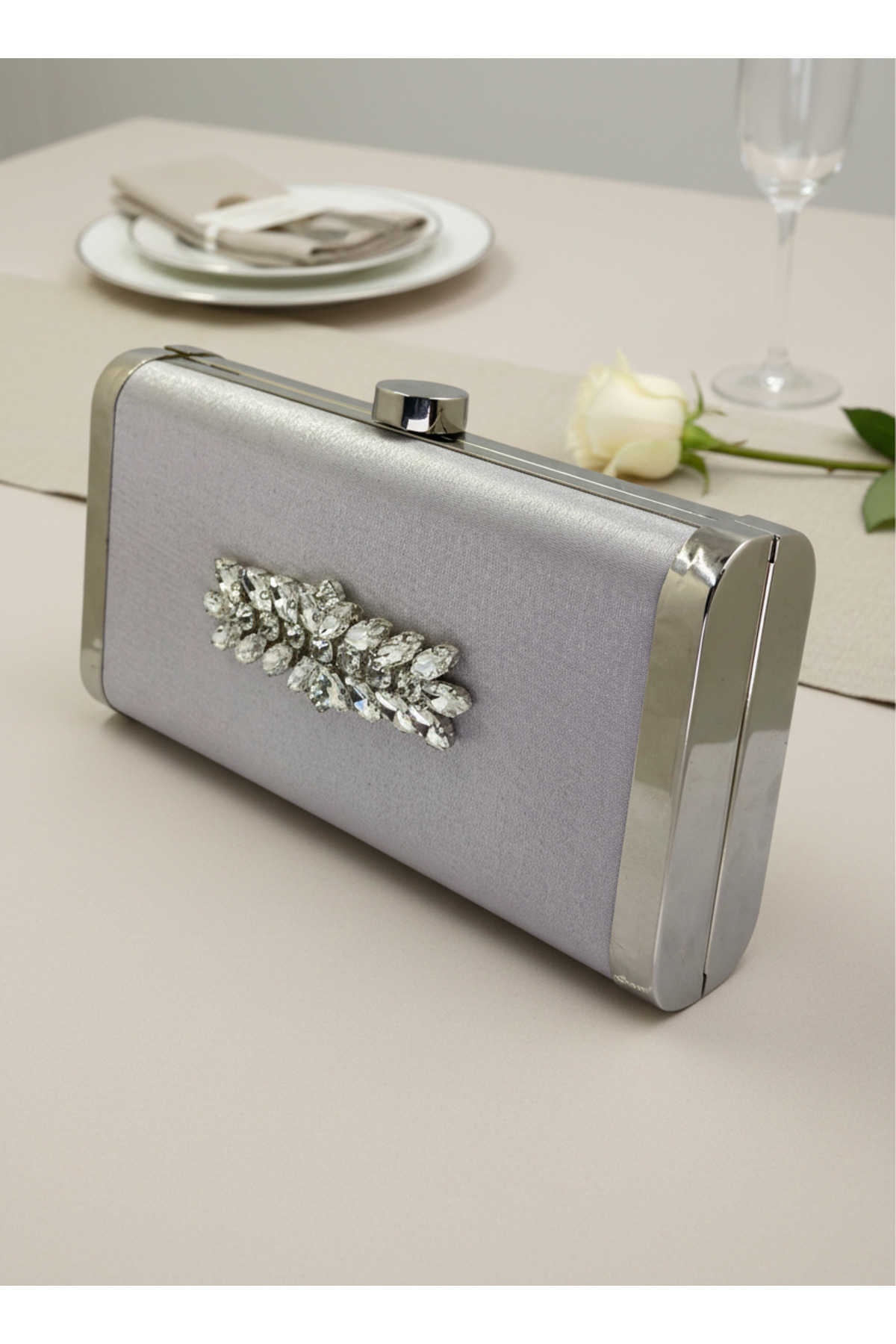 Gümüş Gri Komple Metal Çerçeve ve Kristal İşlemeli Simli Saten Abiye Çanta Düğün Nişan Mezuniyet Gümüş Gri Komple Metal Çerçeve ve Kristal İşlemeli Simli Saten Abiye Çanta Düğün Nişan Mezuniyet 15-11 تک سایز