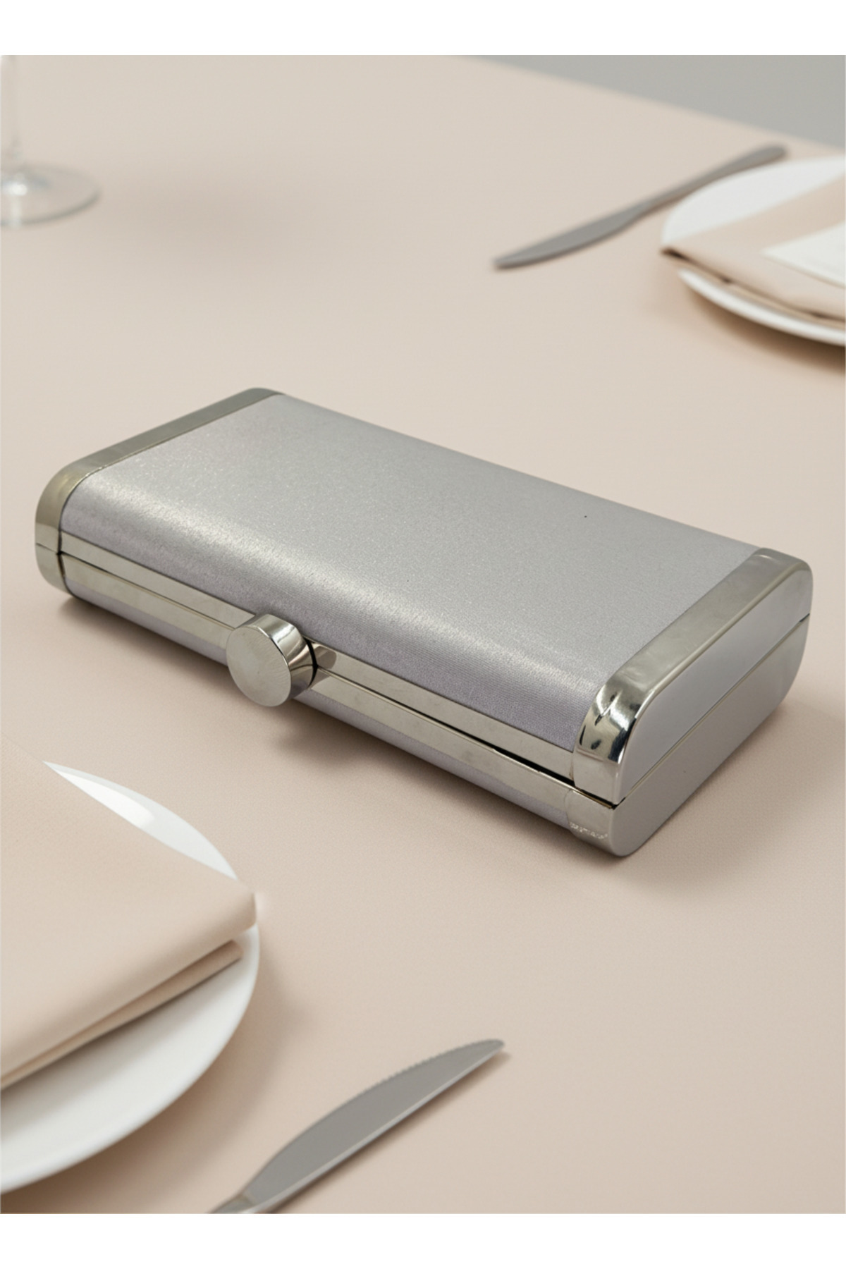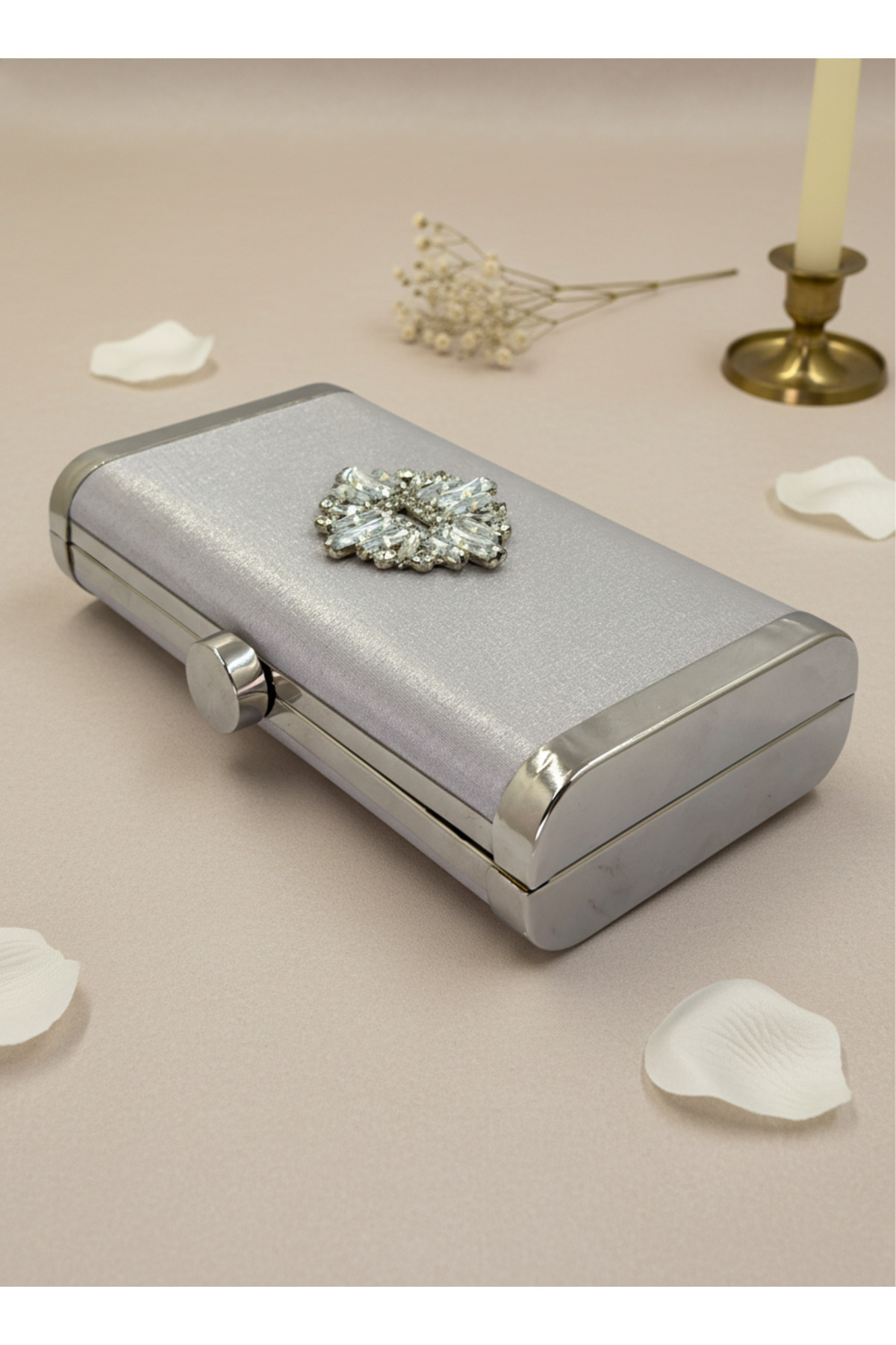 Gümüş Gri Komple Metal Çerçeve ve Kristal İşlemeli Simli Saten Abiye Çanta Düğün Nişan Mezuniyet Gümüş Gri Komple Metal Çerçeve ve Kristal İşlemeli Simli Saten Abiye Çanta Düğün Nişan Mezuniyet 15-11 تک سایز