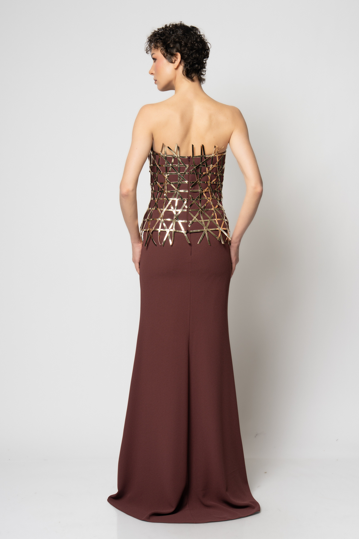 Büstiyeri çapraz örgü deri biyeli krep etekli ikili abiye takım Büstiyeri çapraz örgü deri biyeli krep etekli ikili abiye takım 6402 44