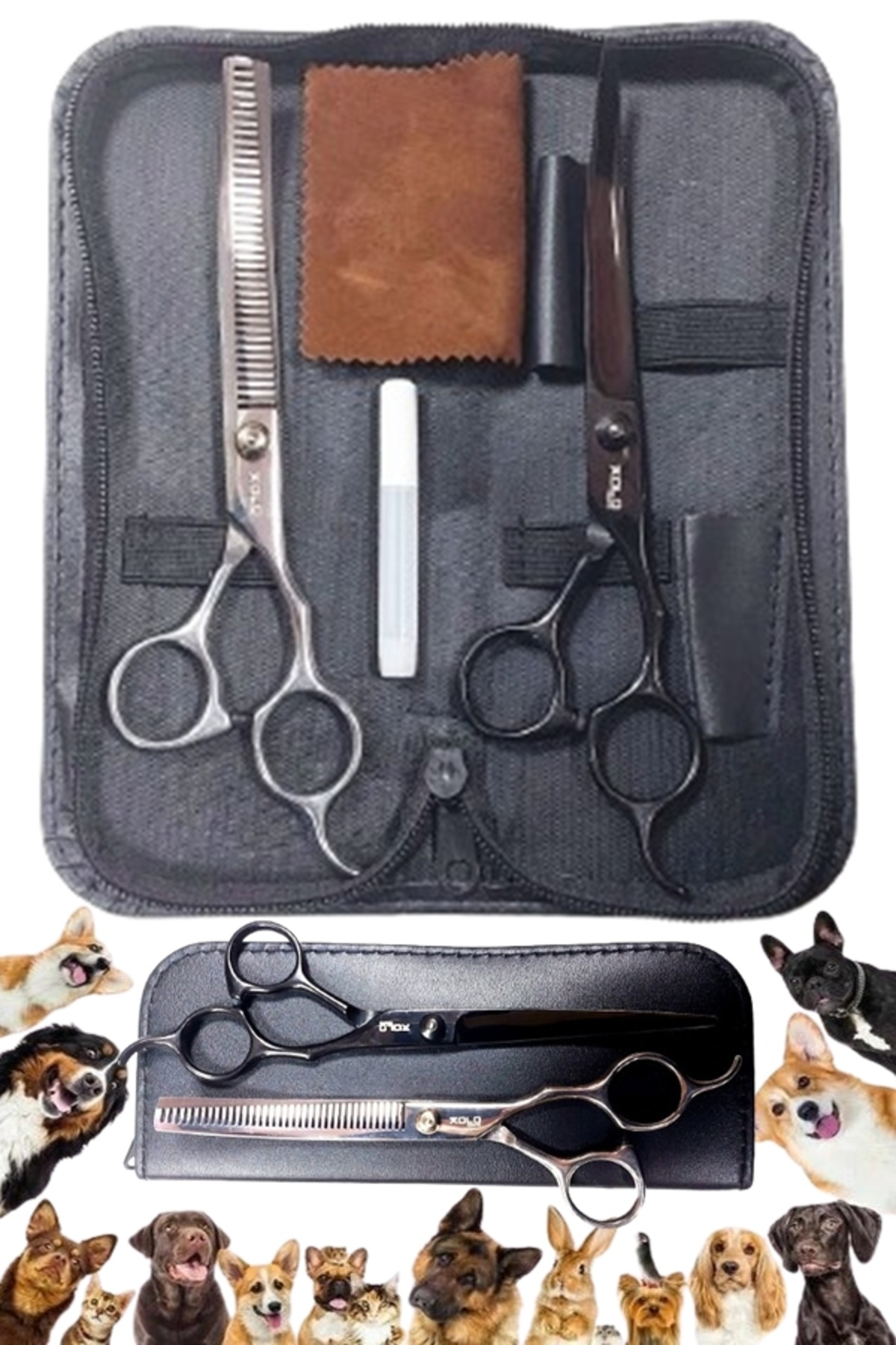 Pet Kuaför Çantalı Kavisli Makas Seti 7 Inch Profesyonel Kesim ve Tüy Toplama İnceltme Makas Seti Pet Kuaför Çantalı Kavisli Makas Seti 7 Inch Profesyonel Kesim ve Tüy Toplama İnceltme Makas Seti KVSMKSD47 تک سایز
