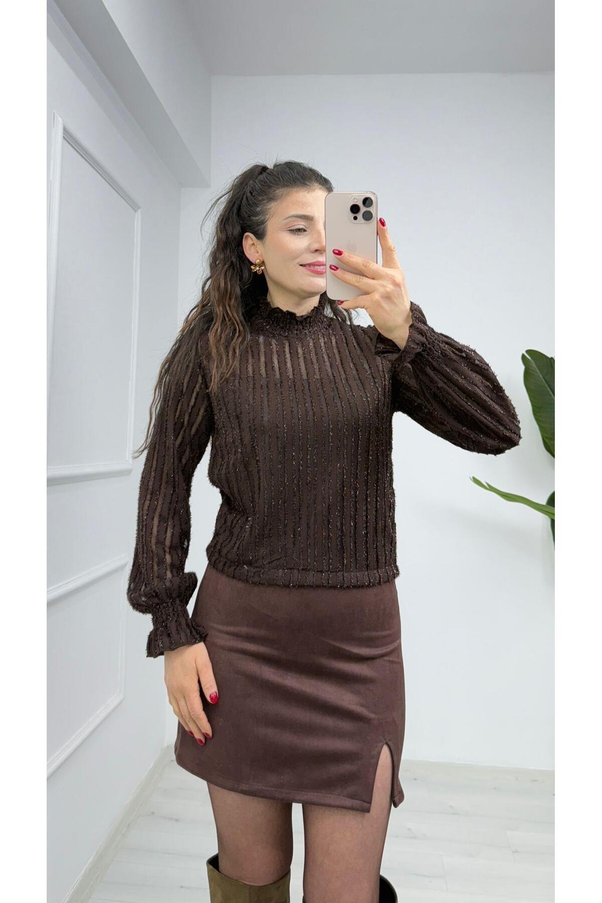 1852 Transparan Şeritli Dik Yaka Simli Bluz Kahve 1852 Transparan Şeritli Dik Yaka Simli Bluz Kahve TNMB0XTNMB01007 XL