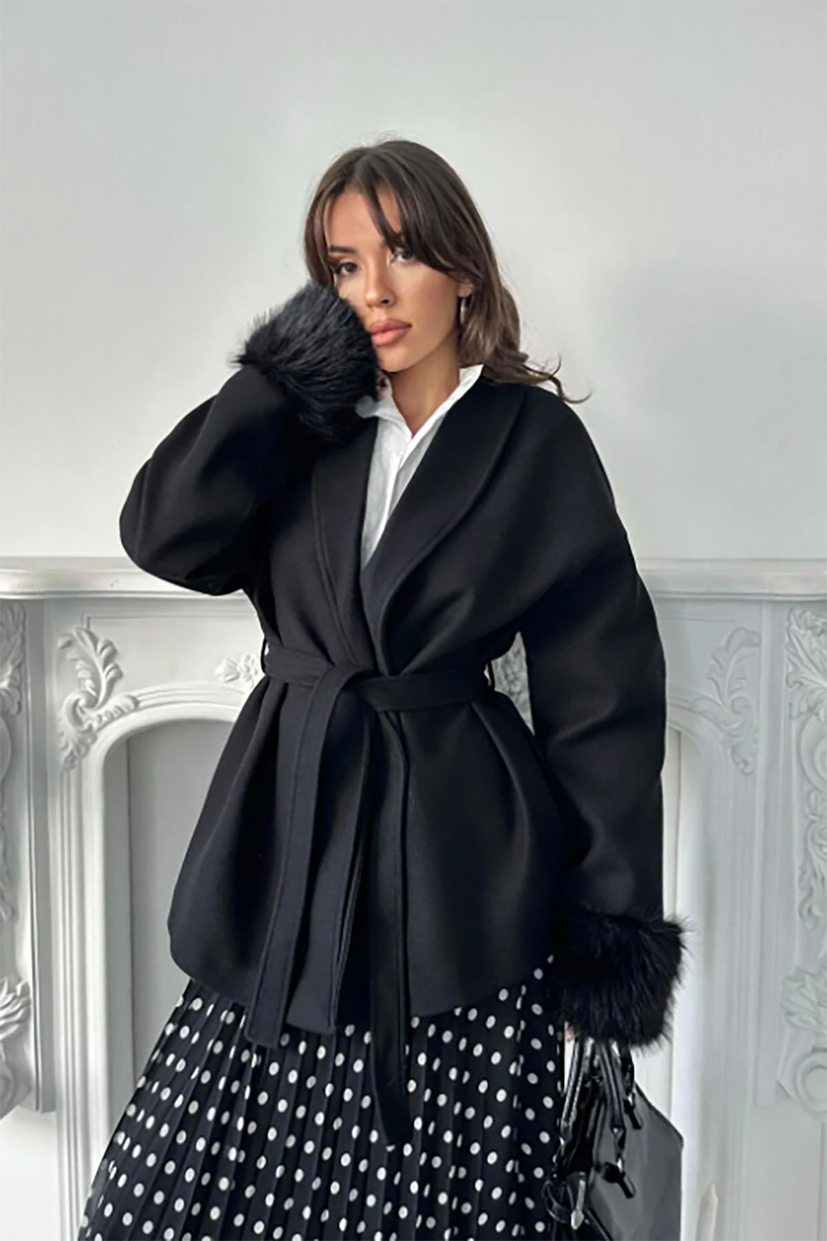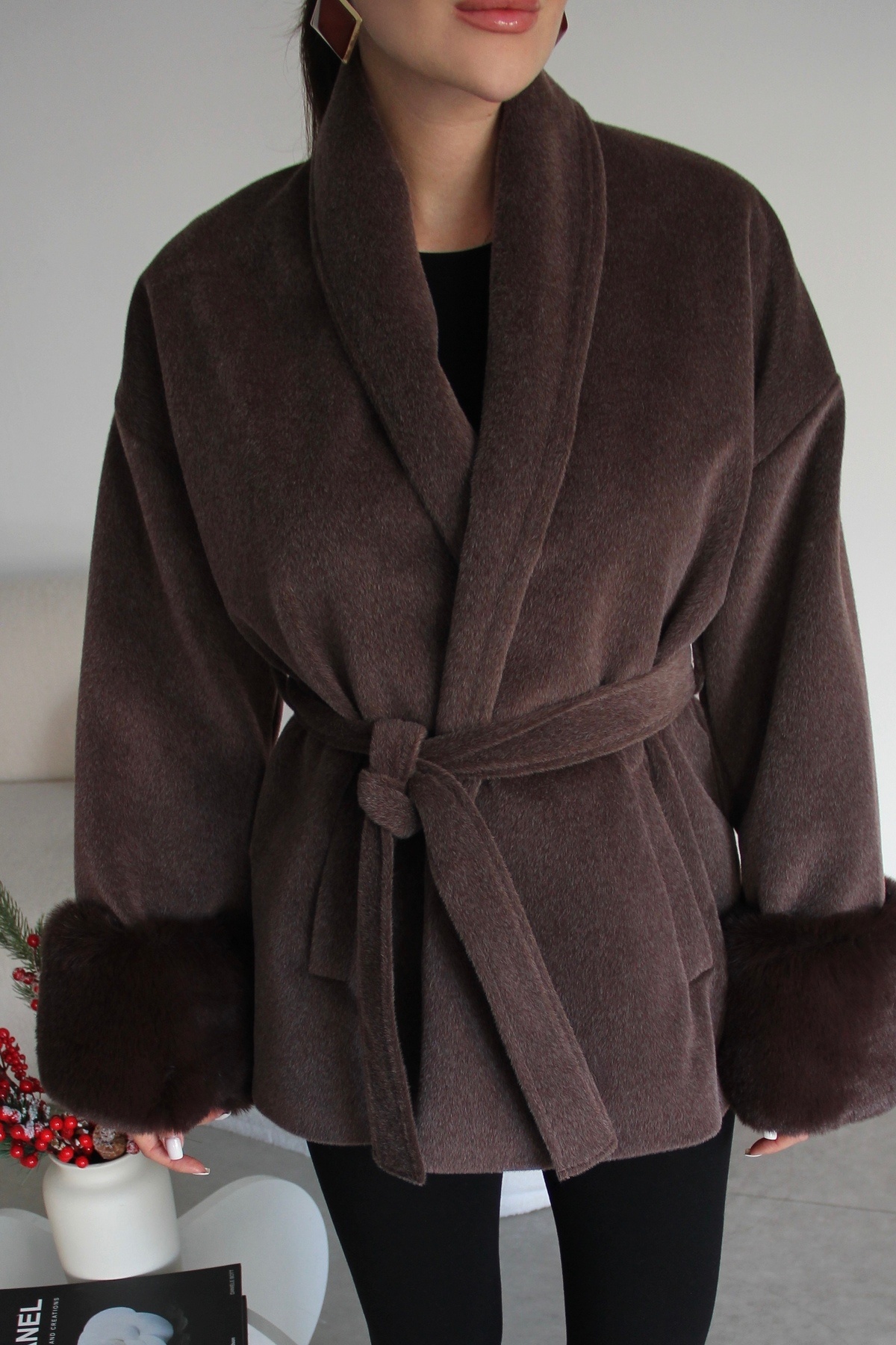 Kahve Kolları Kürk Detaylı(Çıkabilir) Kruvaze Yaka Kuşaklı Kaşe Kaban Kahve Kolları Kürk Detaylı(Çıkabilir) Kruvaze Yaka Kuşaklı Kaşe Kaban BerfKRYN0 L