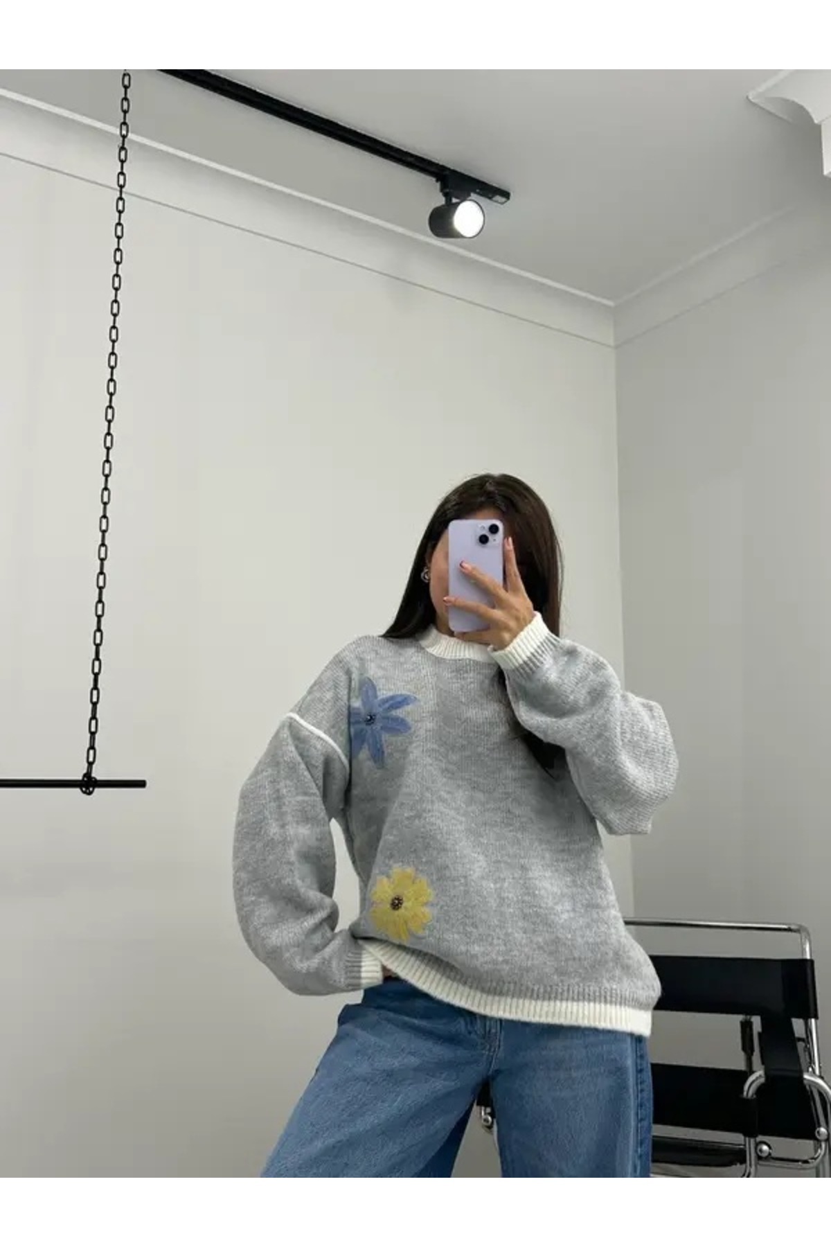 ZR model orjinal triko overize çiçek detaylı kazak ZR model orjinal triko overize çiçek detaylı kazak 1002