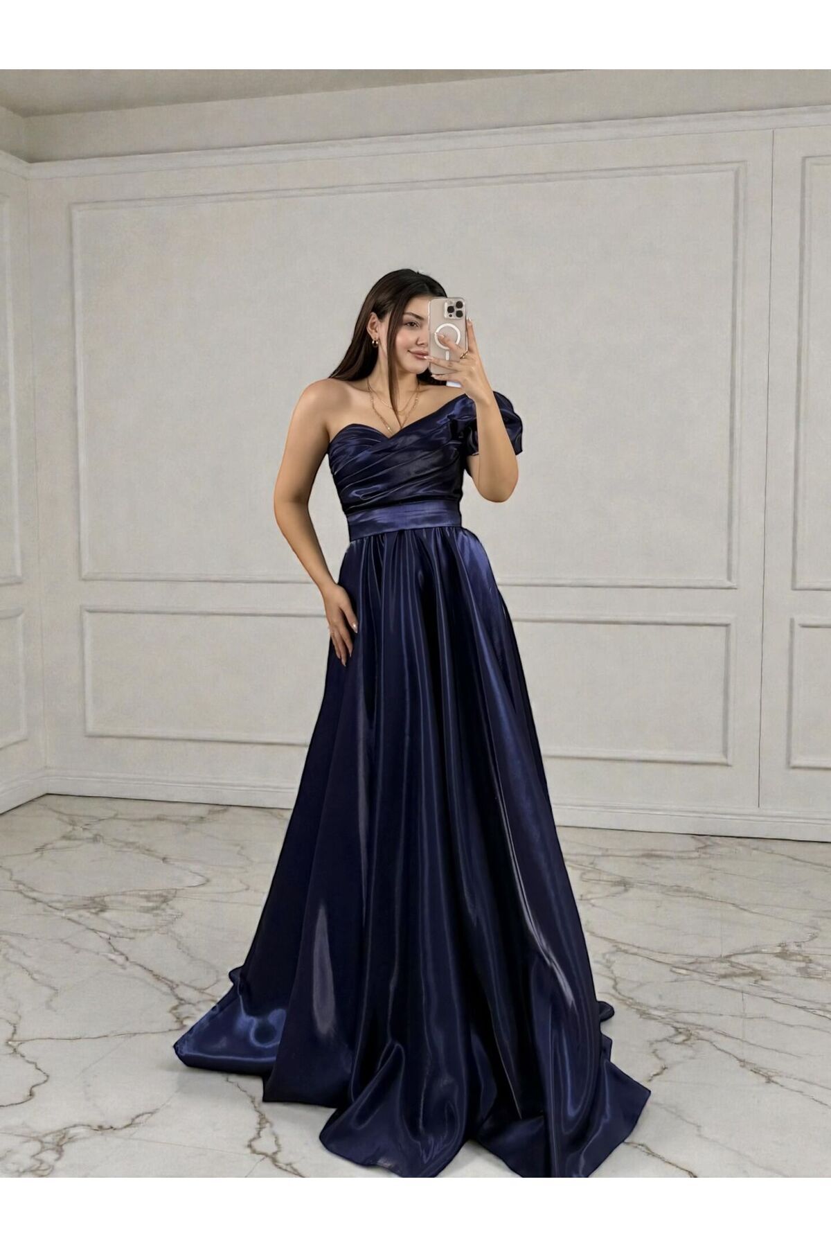 Galya Tek Kol Saten Parlak Saks Abiye Elbise-38 Galya Tek Kol Saten Parlak Saks Abiye Elbise-38 GLYZ12345G11 42