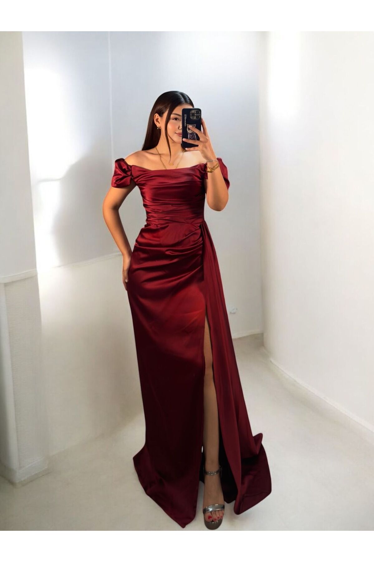 Venis Balon Düşük Kollu Gizli Yırtmaçlı Saten Bordo Abiye Elbise-42 Venis Balon Düşük Kollu Gizli Yırtmaçlı Saten Bordo Abiye Elbise-42 BLNK20 42