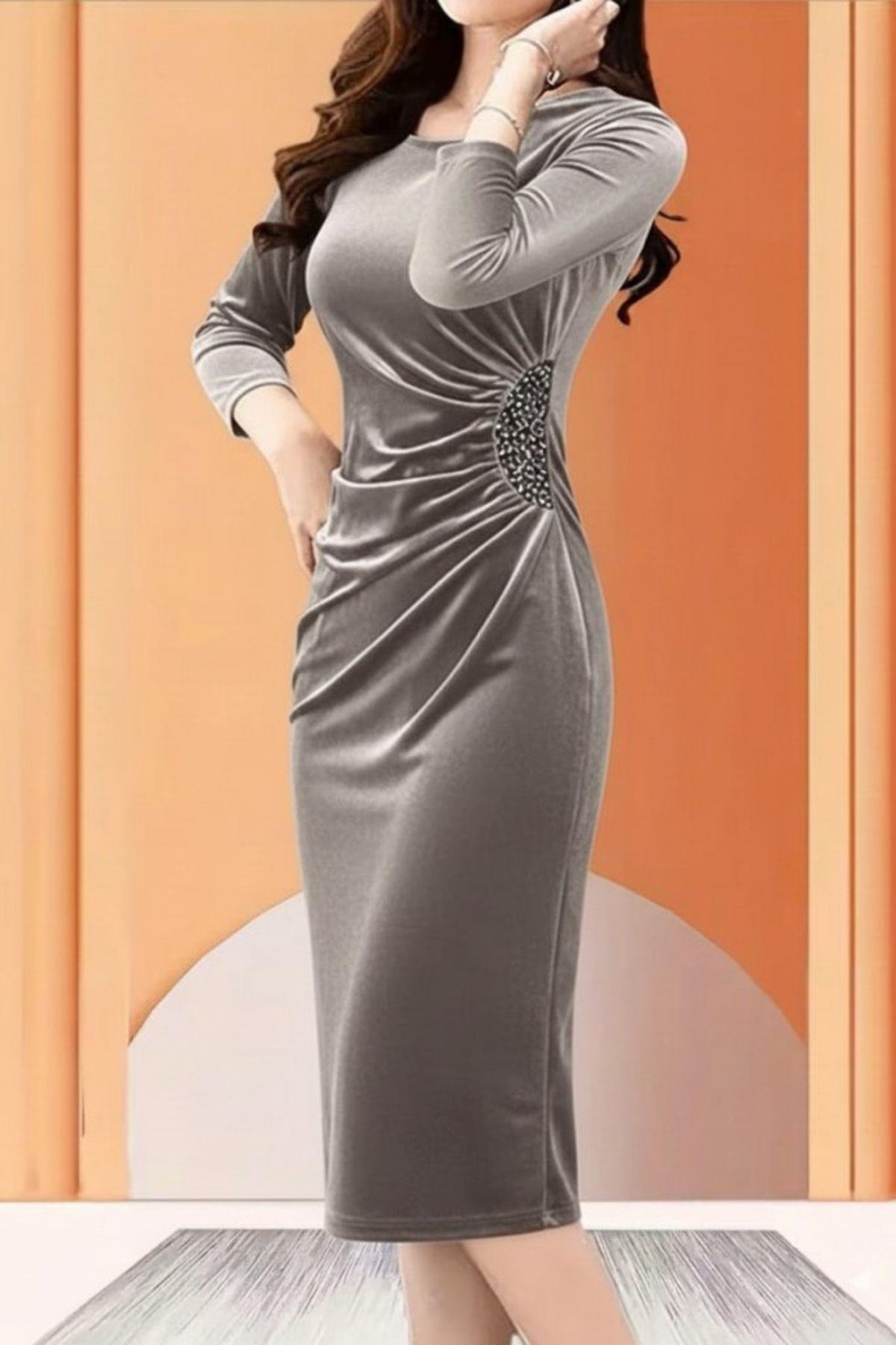 Kruvaze Yaka Bel Büzgü Detay Midi Kadife Elbise Kruvaze Yaka Bel Büzgü Detay Midi Kadife Elbise DOPJS46040DOP 2XL-3XL