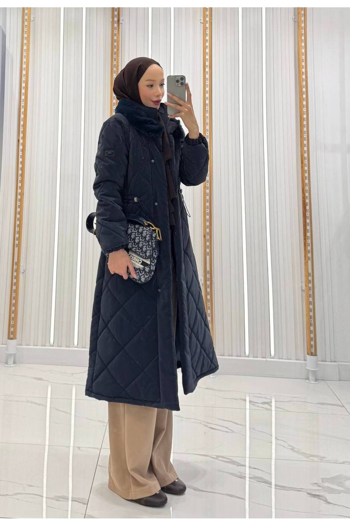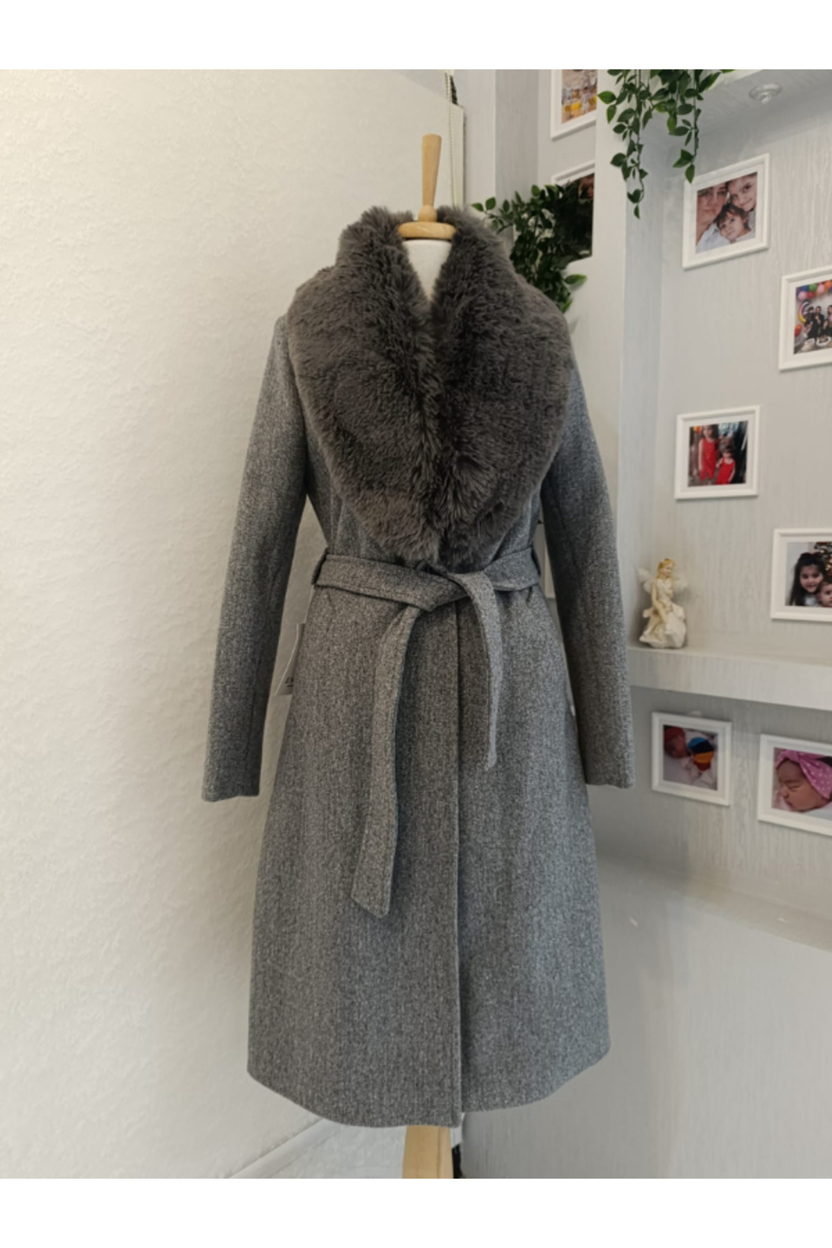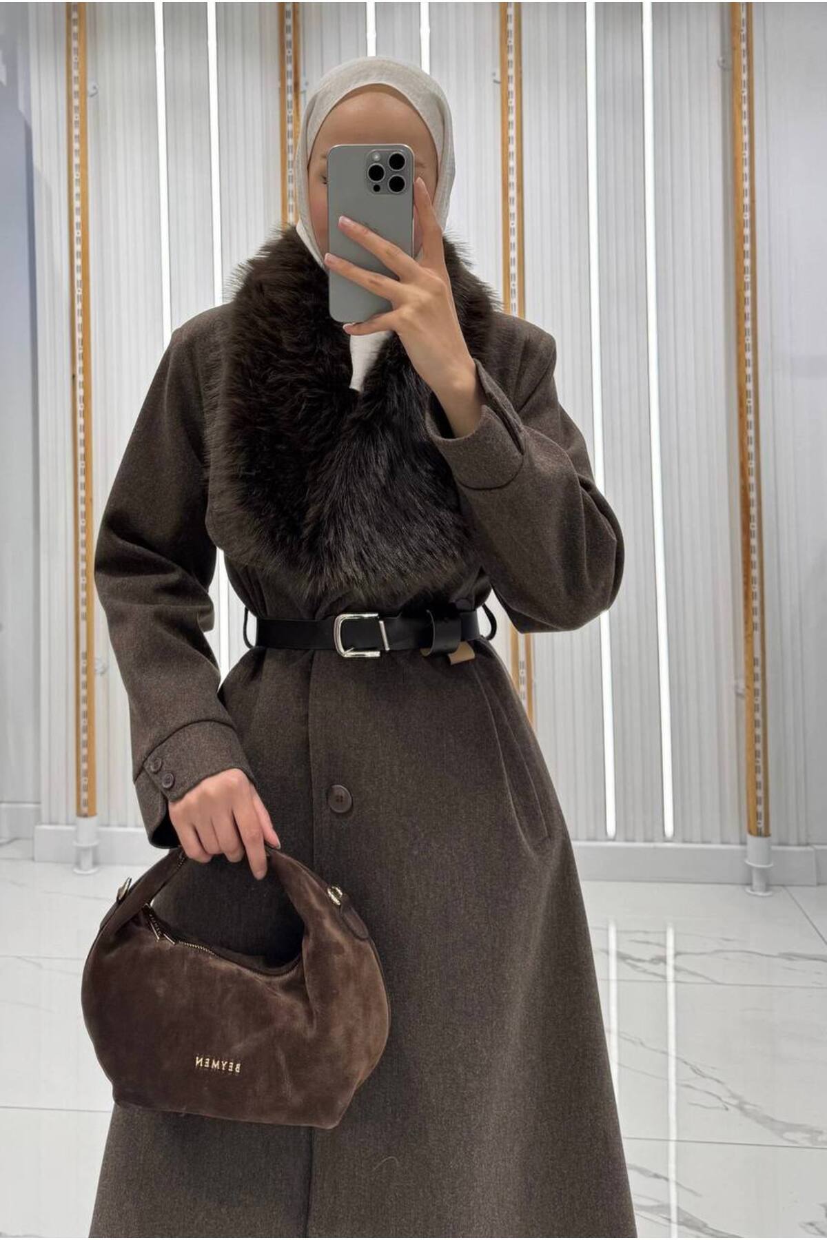 Yakası Kürklü Kemerli Kahverengi Kaşe Kaban Yakası Kürklü Kemerli Kahverengi Kaşe Kaban QMR-2196 42-44