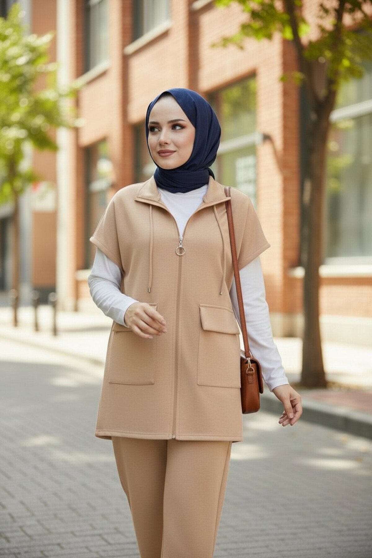 Yelekli Premium Modal Kumaş Tesettür İkili Takım - Bej Yelekli Premium Modal Kumaş Tesettür İkili Takım - Bej luna-7202 50