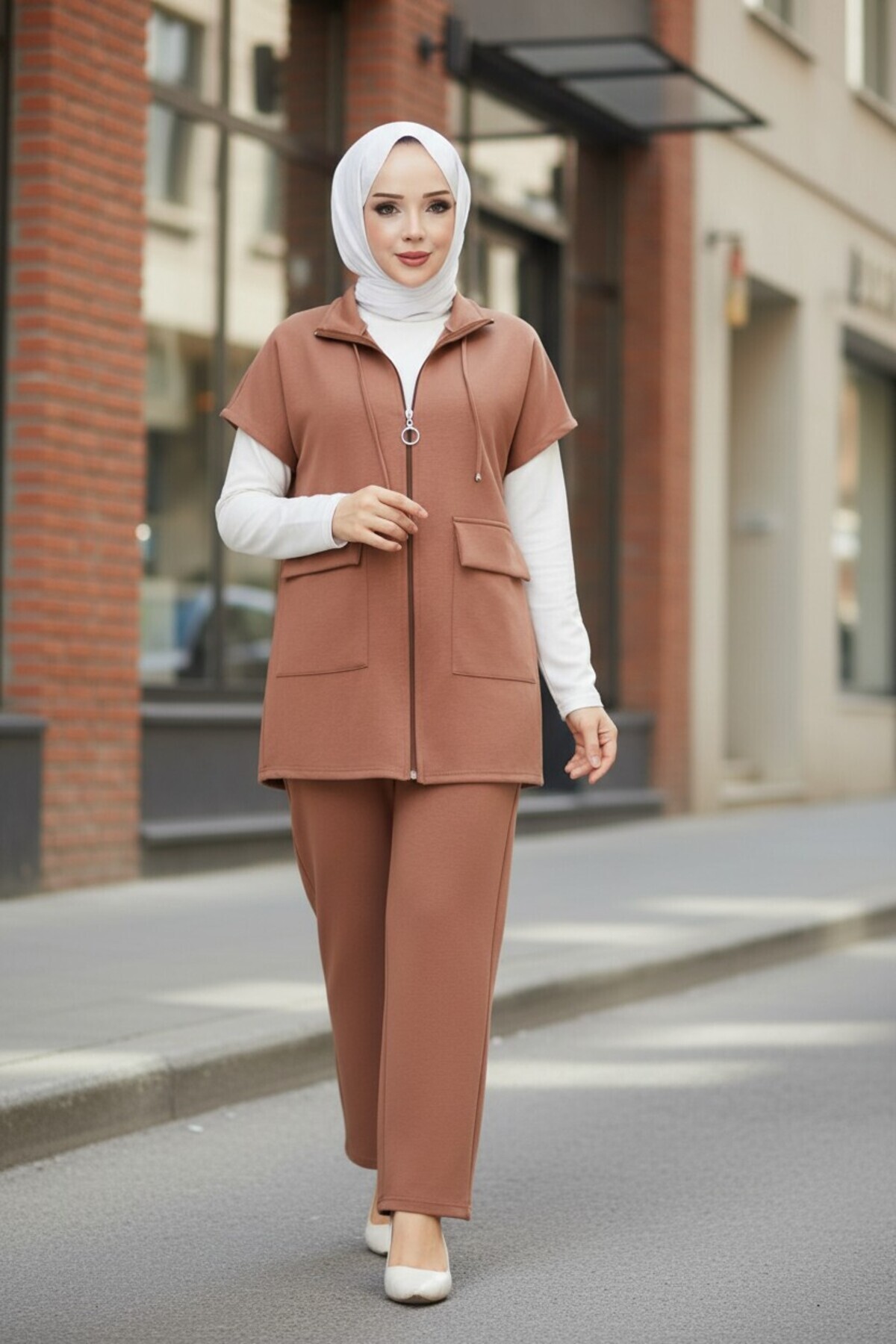 Yelekli Premium Modal Kumaş Tesettür İkili Takım - Taba Yelekli Premium Modal Kumaş Tesettür İkili Takım - Taba luna-7202 50