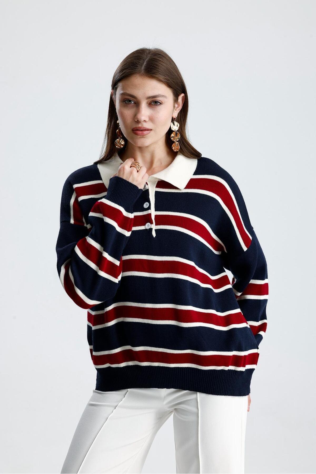 Kadın Çizgili Bordo Polo Yaka Düğmeli Triko Kazak Kadın Çizgili Bordo Polo Yaka Düğmeli Triko Kazak Flosteelpoloyakabordo Standart
