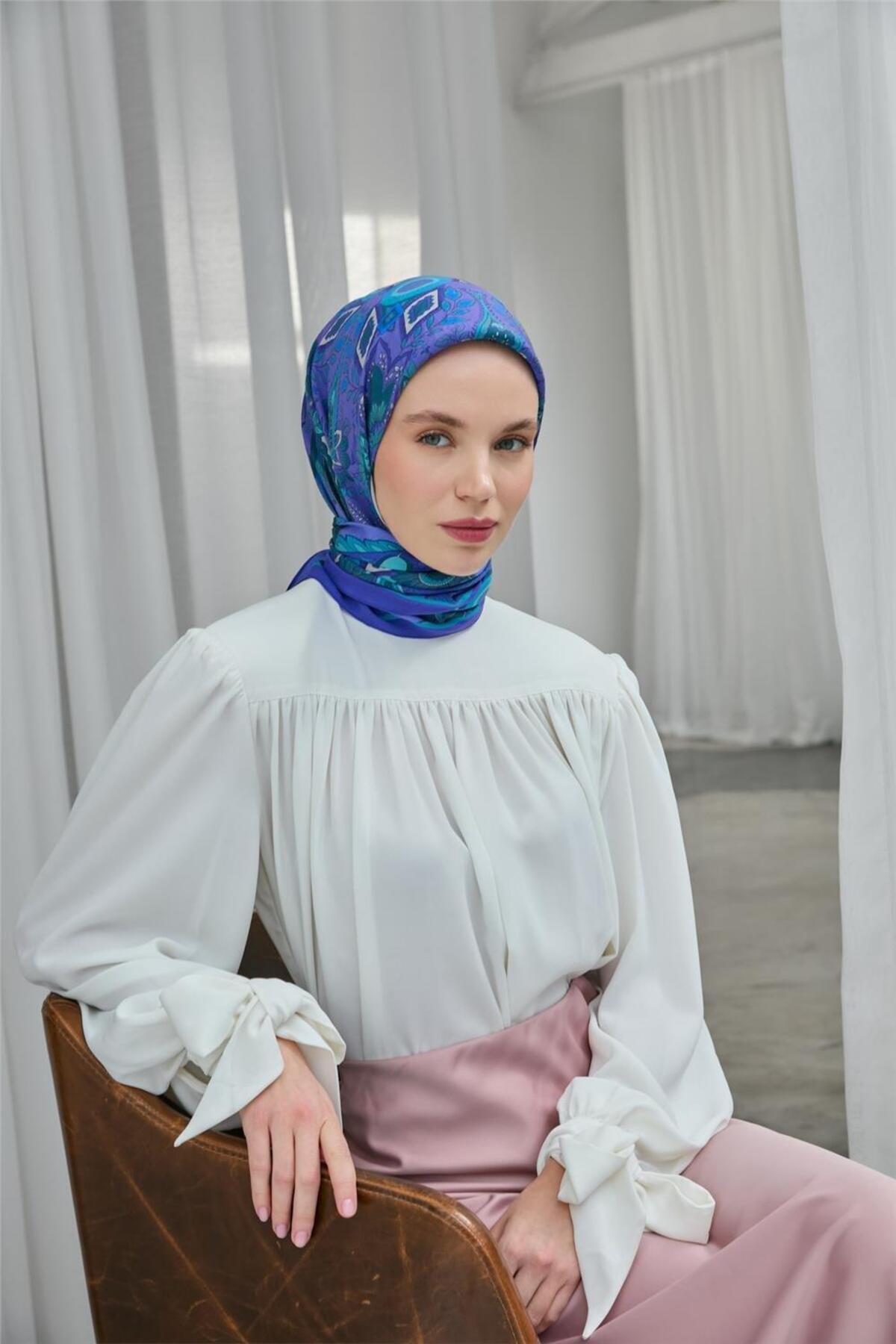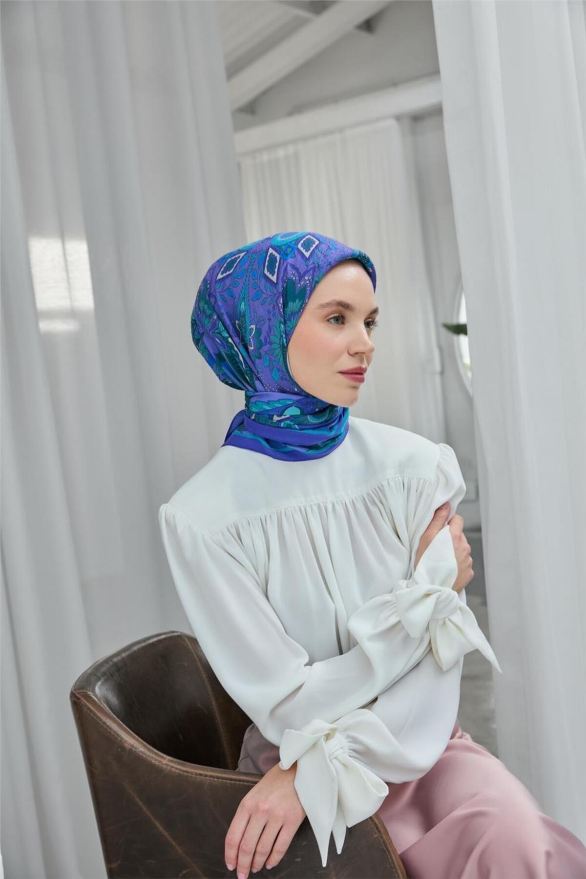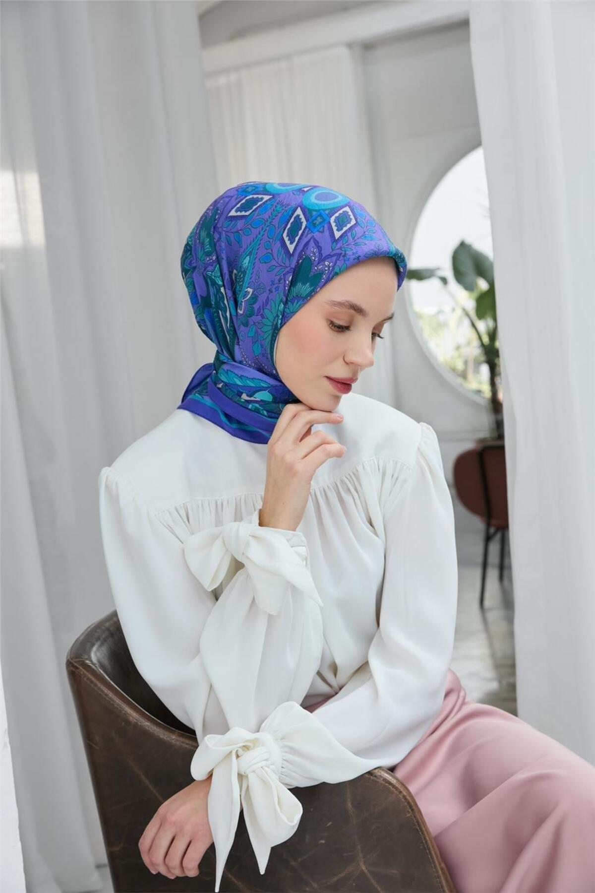 Viskon Eşarp Mor-Turkuaz Desenli Kaymaz Tok Duruşlu 90x90 Viskon Eşarp Mor-Turkuaz Desenli Kaymaz Tok Duruşlu 90x90 161006 تک سایز