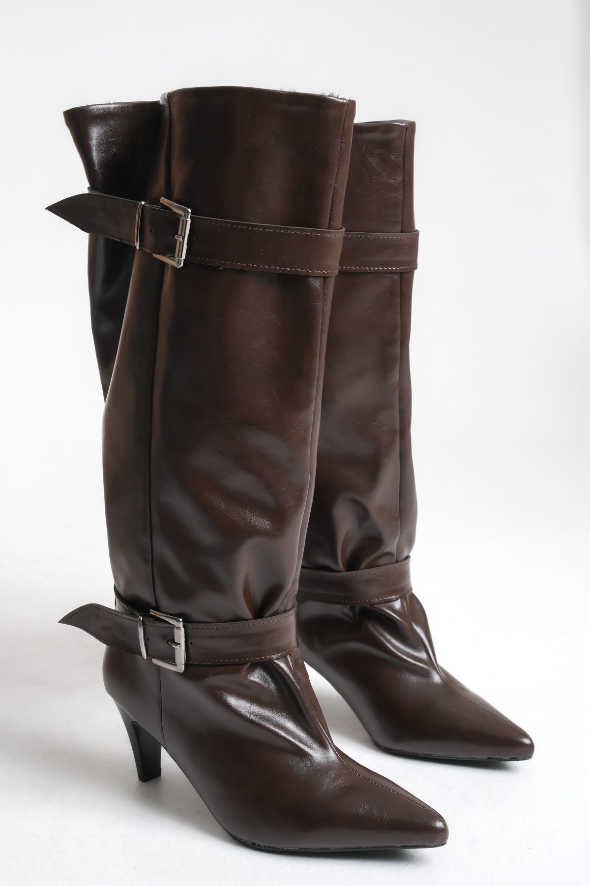 Kahverengi Parlak Deri Kadın Çizme Mini Kısa Topuklu Tokalı Diz Altı Kaymaz Taban Freya Kahverengi Parlak Deri Kadın Çizme Mini Kısa Topuklu Tokalı Diz Altı Kaymaz Taban Freya Freyacizme 40