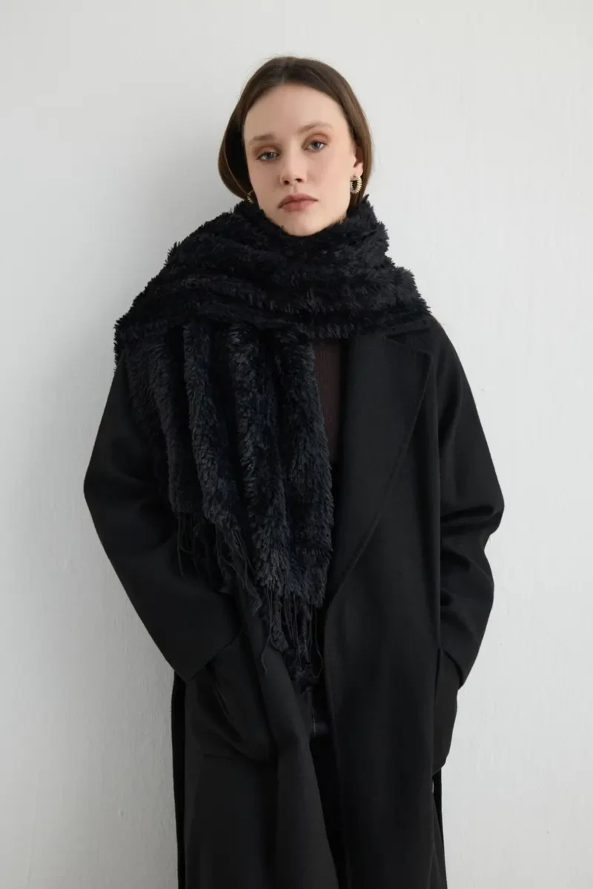 Püsküllü Peluş Şal - Siyah Püsküllü Peluş Şal - Siyah 26KN064 تک سایز