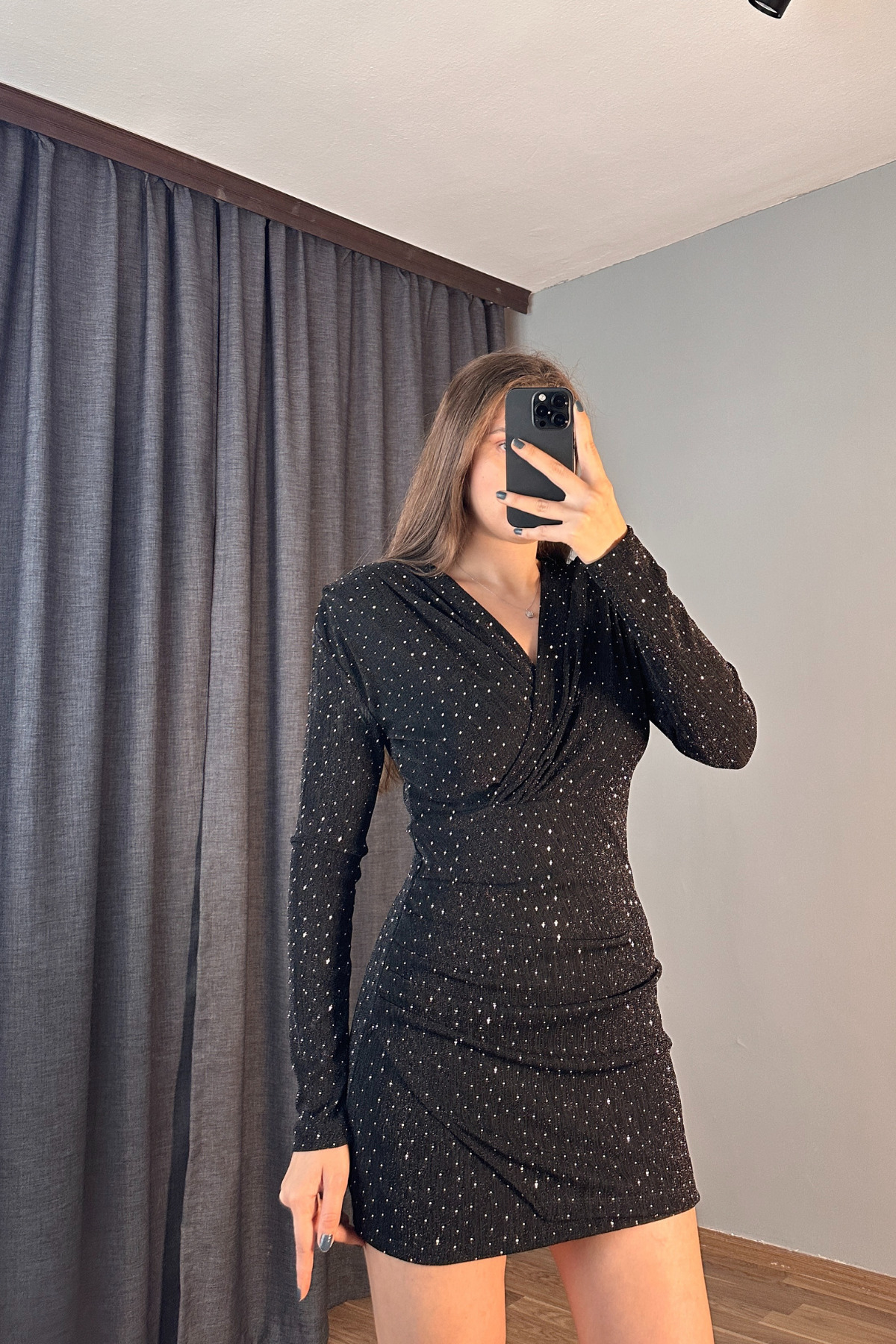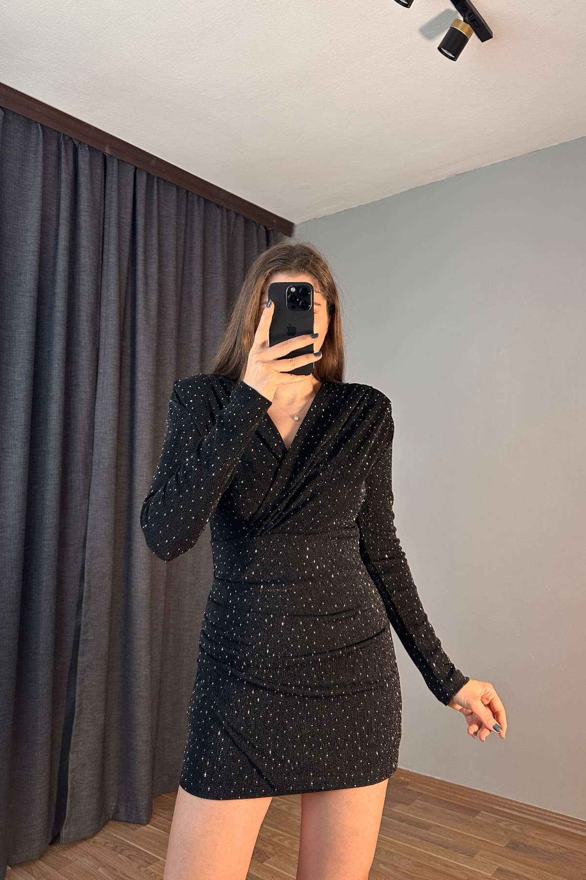 Taşlı Vatkalı Kruvaze Yaka Eteği Asimetrik Mini Elbise Taşlı Vatkalı Kruvaze Yaka Eteği Asimetrik Mini Elbise G1916 L