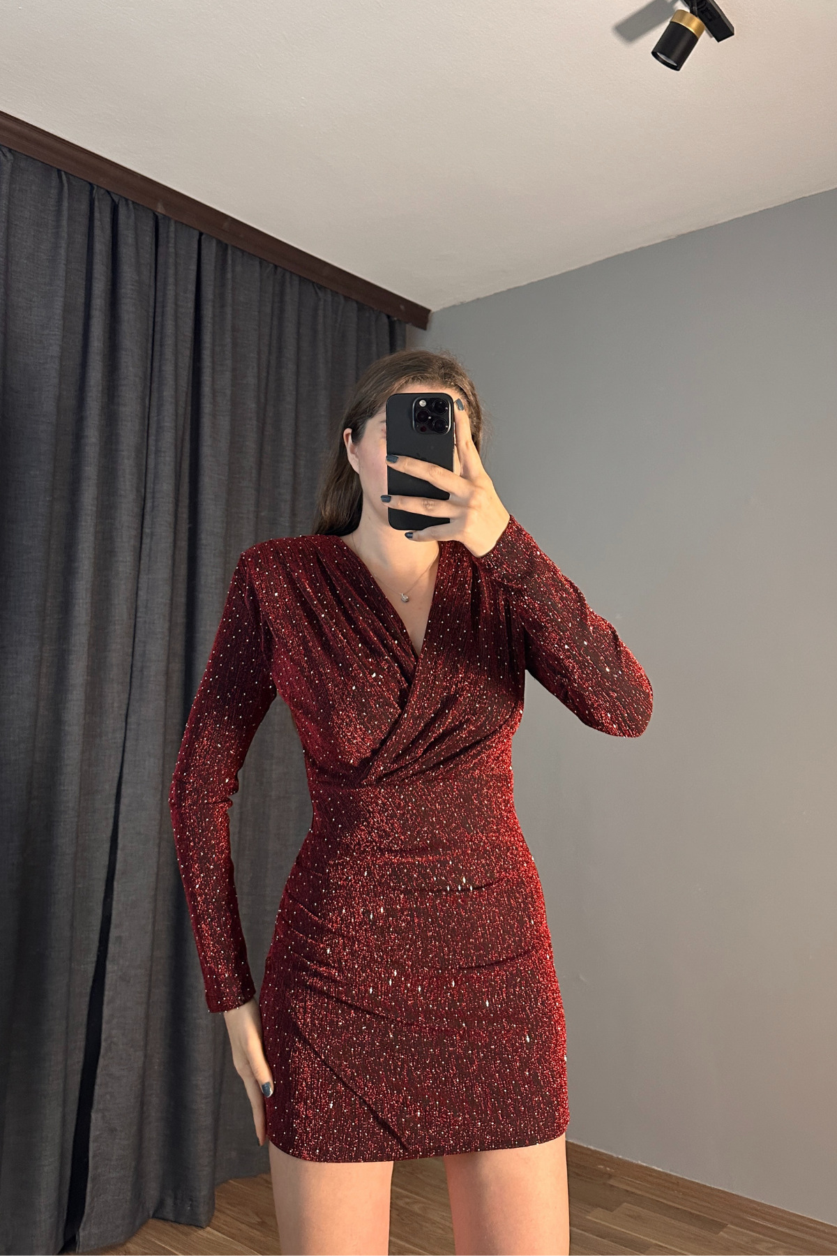 Taşlı Vatkalı Kruvaze Yaka Eteği Asimetrik Mini Elbise Taşlı Vatkalı Kruvaze Yaka Eteği Asimetrik Mini Elbise G1916 L