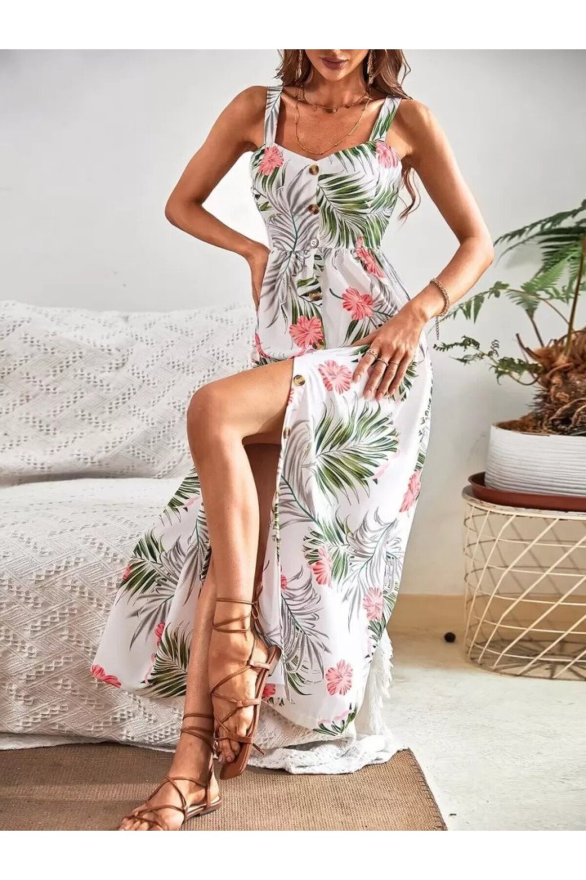 EQURİ Kadın Askılı önden Düğmeli Yaprak Desenli Uzun Süprem Elbise EQURİ Kadın Askılı önden Düğmeli Yaprak Desenli Uzun Süprem Elbise LADY-163843 2XL-3XL
