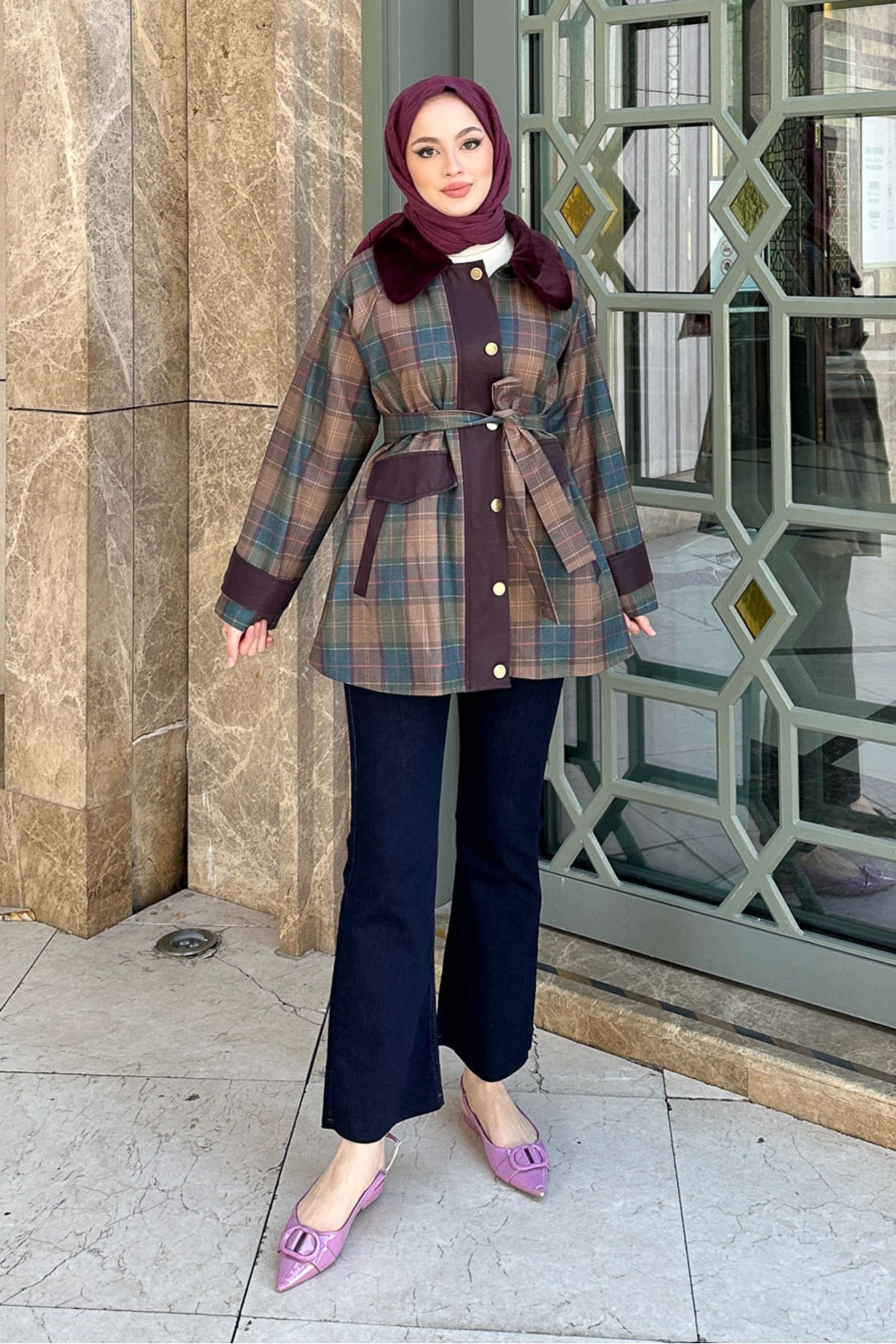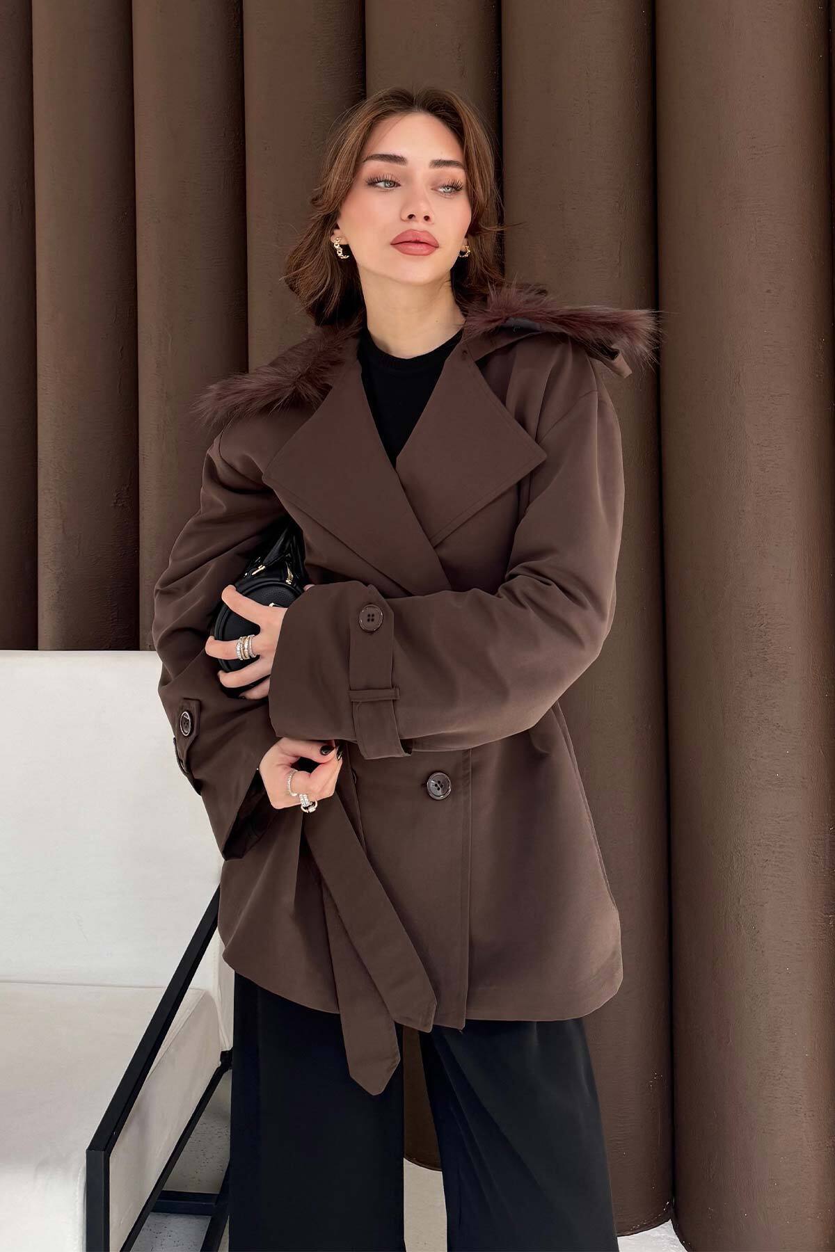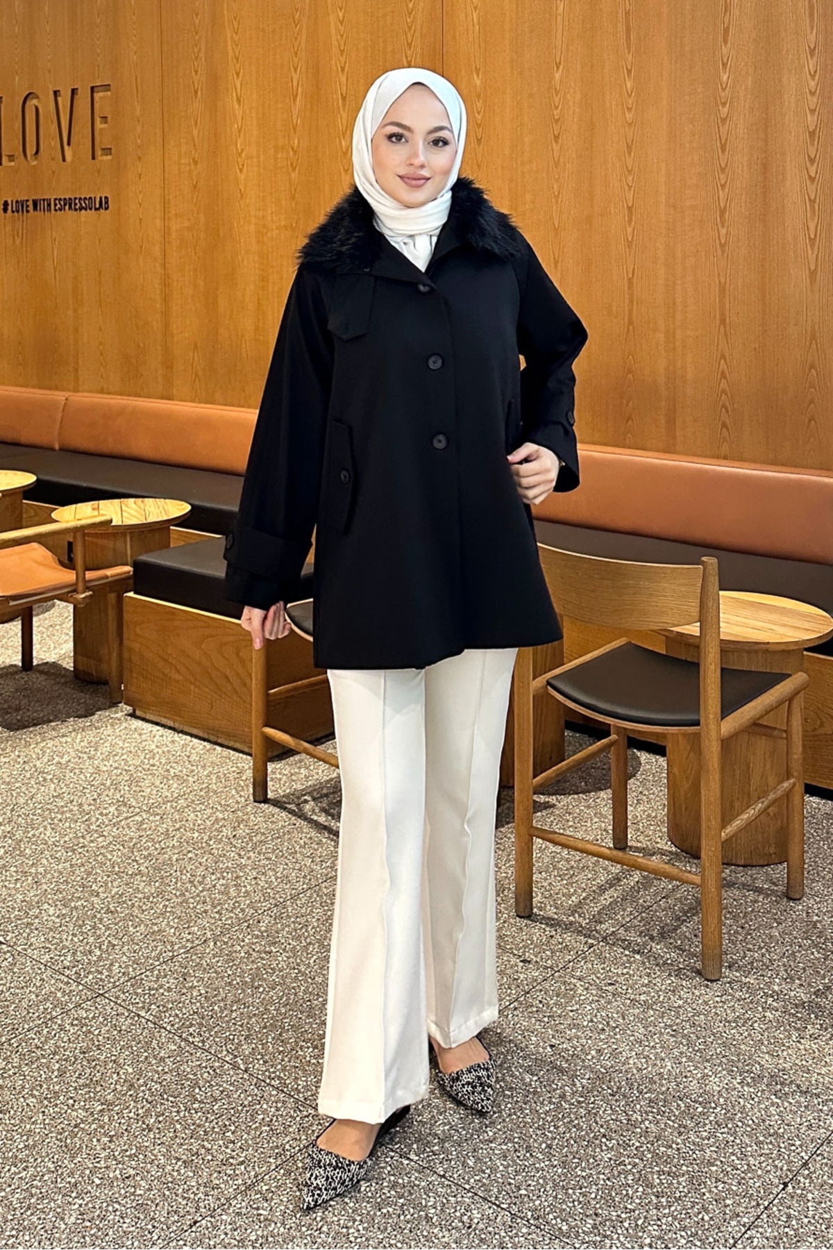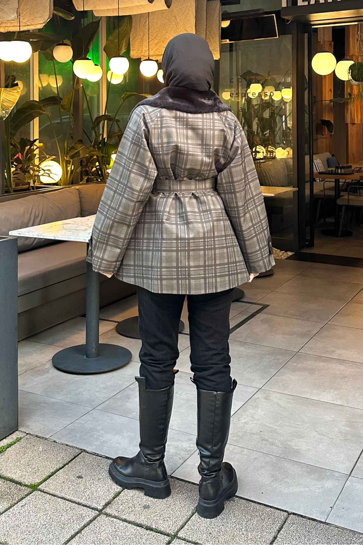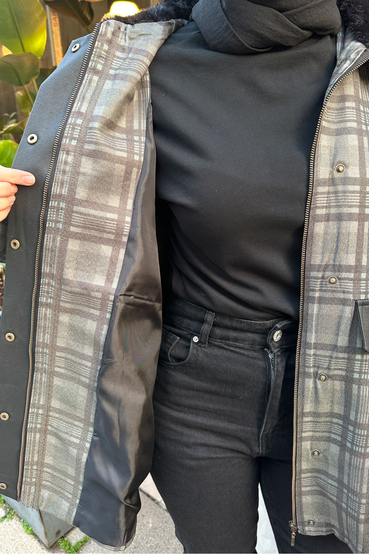 Kürk Yaka Garnili Ekose Trenç - Siyah Kürk Yaka Garnili Ekose Trenç - Siyah 7131 L/XL