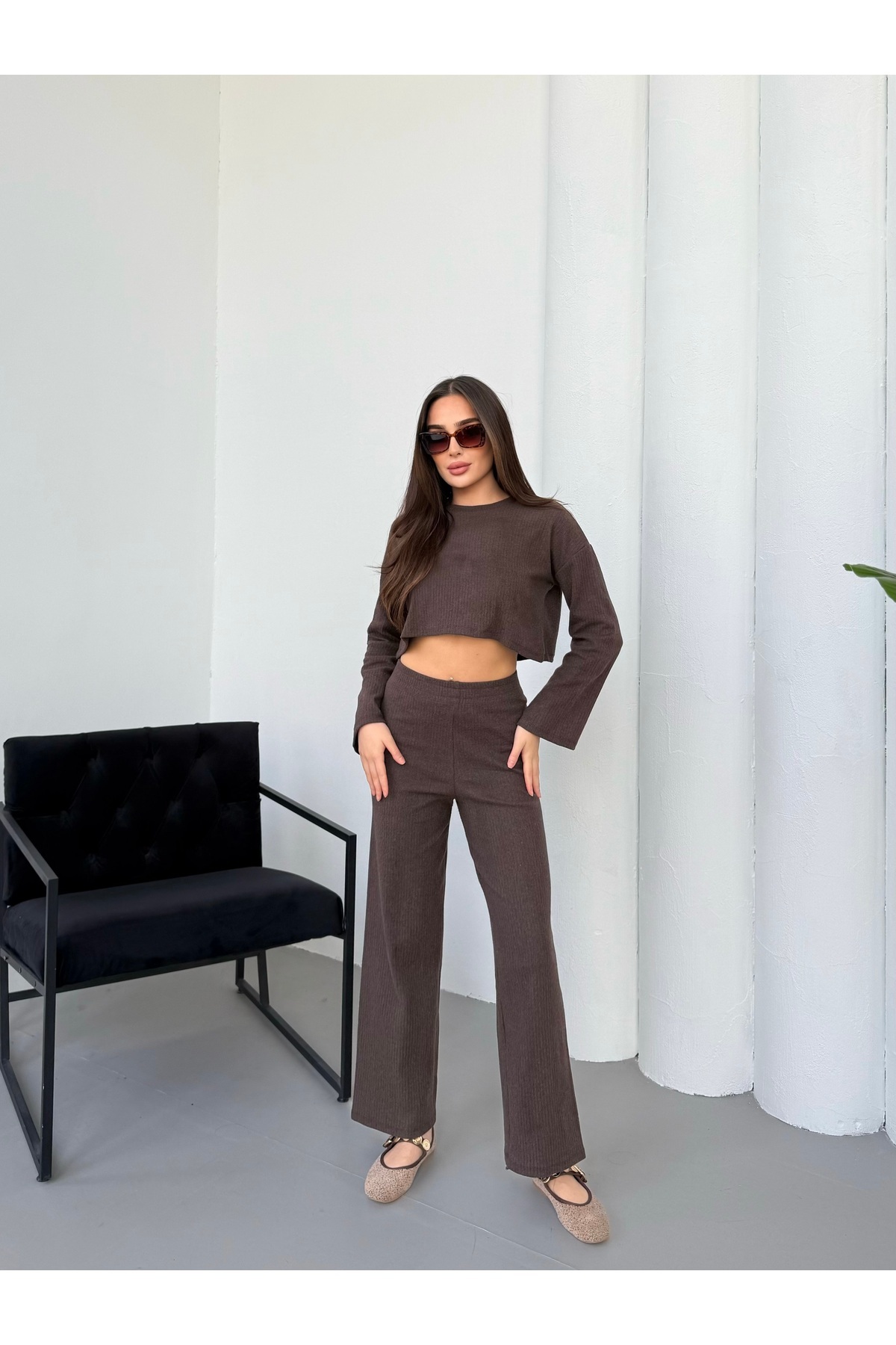 Kadın Uzun Kollu Dokulu Üst + Geniş Paça Pantolon Takım Kadın Uzun Kollu Dokulu Üst + Geniş Paça Pantolon Takım EL_TREND35 XL