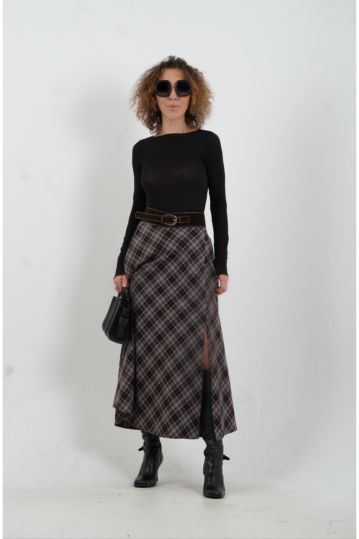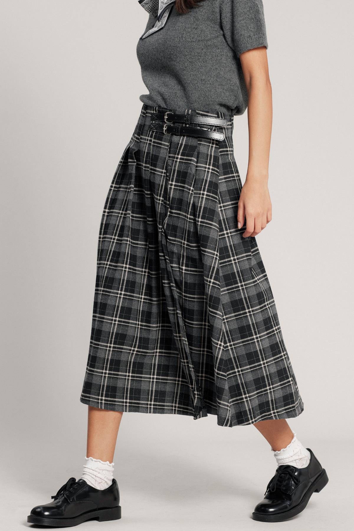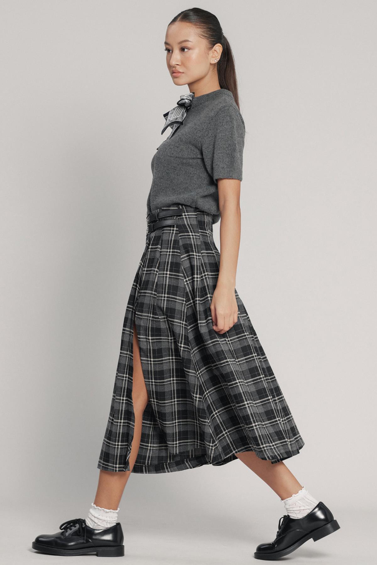 Kemer Detaylı Yırtmaçlı Kloş Ekose Etek KOYU GRİ 7057 Kemer Detaylı Yırtmaçlı Kloş Ekose Etek KOYU GRİ 7057 L