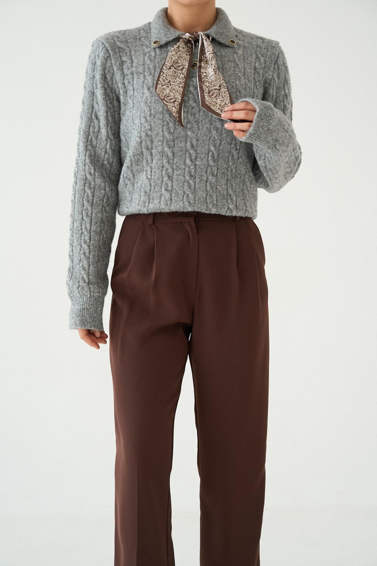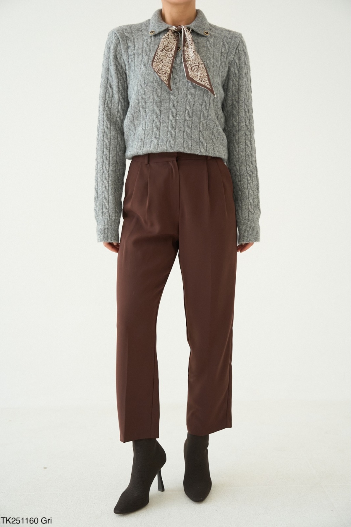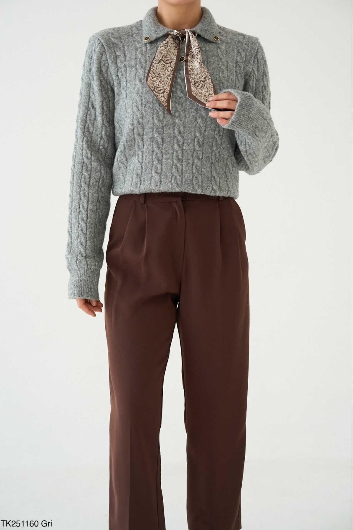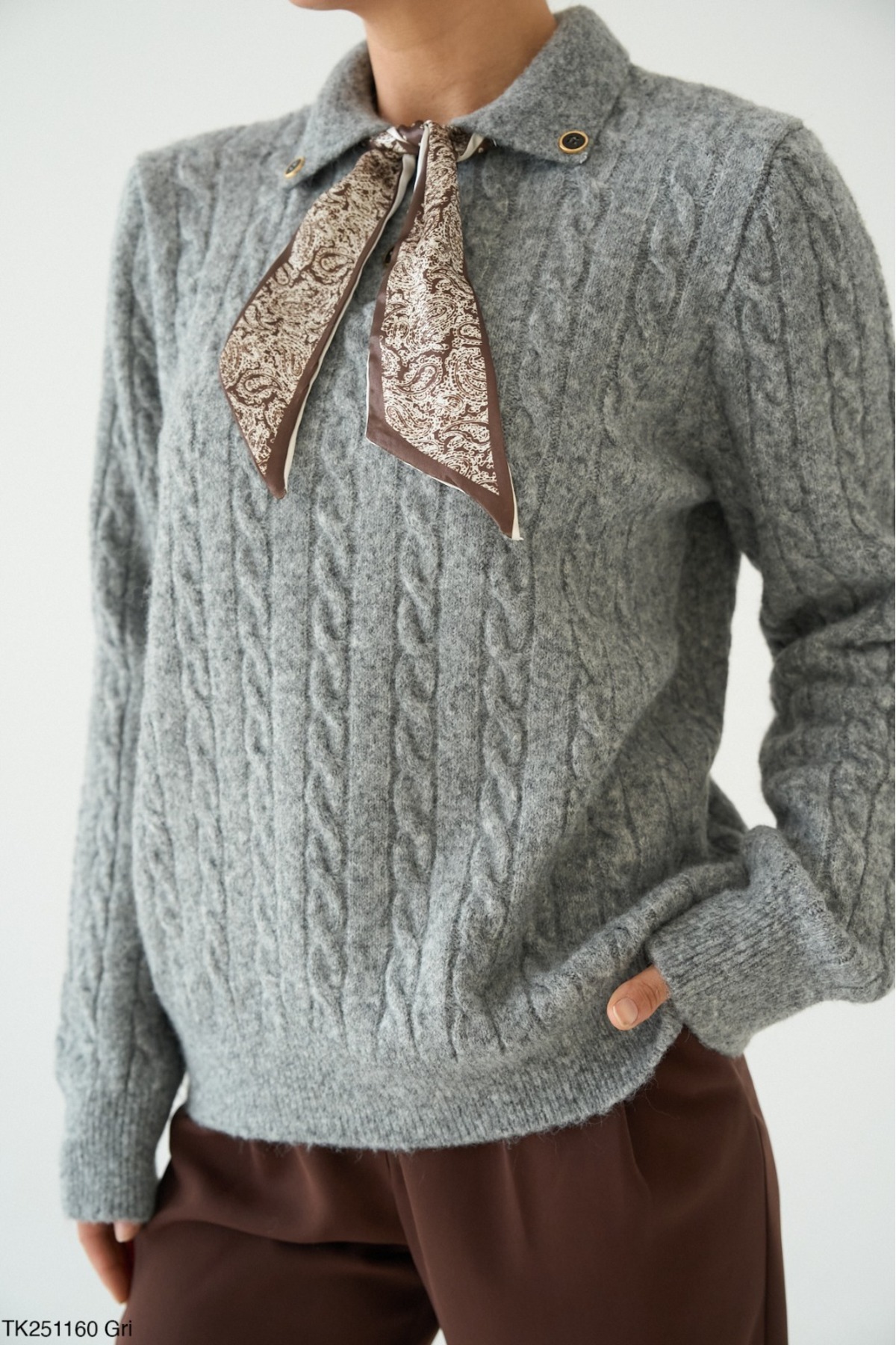 Kadın Fularlı Polo Yaka Uzun Kol Saç Örgü Triko Kazak Kadın Fularlı Polo Yaka Uzun Kol Saç Örgü Triko Kazak TK251160 Standart