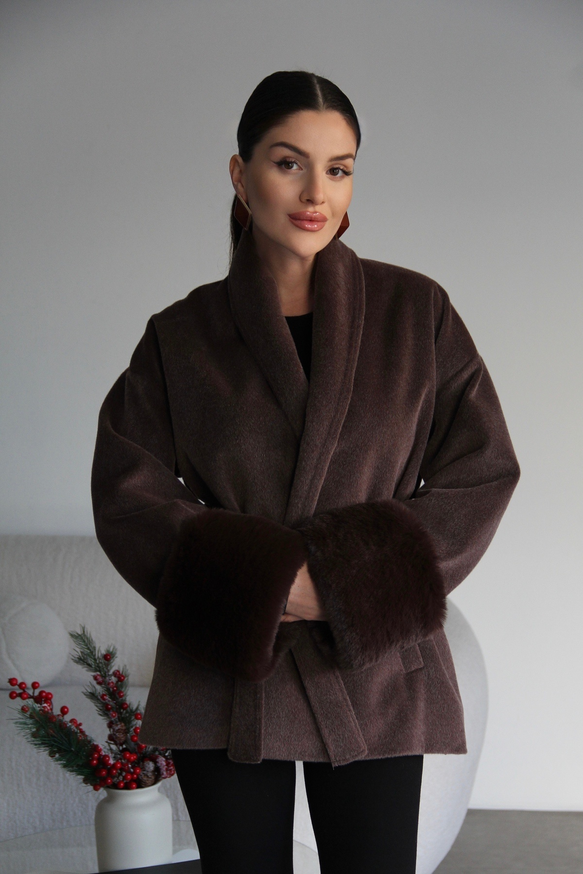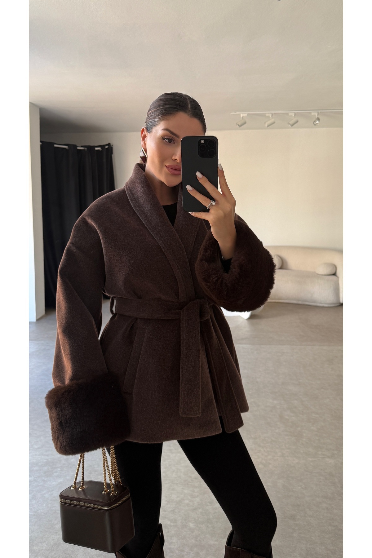 Kahve Kuşaklı Kolları Çıkabilir Kürk Detaylı Premium Kahve Kaşe Kaban Kahve Kuşaklı Kolları Çıkabilir Kürk Detaylı Premium Kahve Kaşe Kaban JulidressKJL12 L