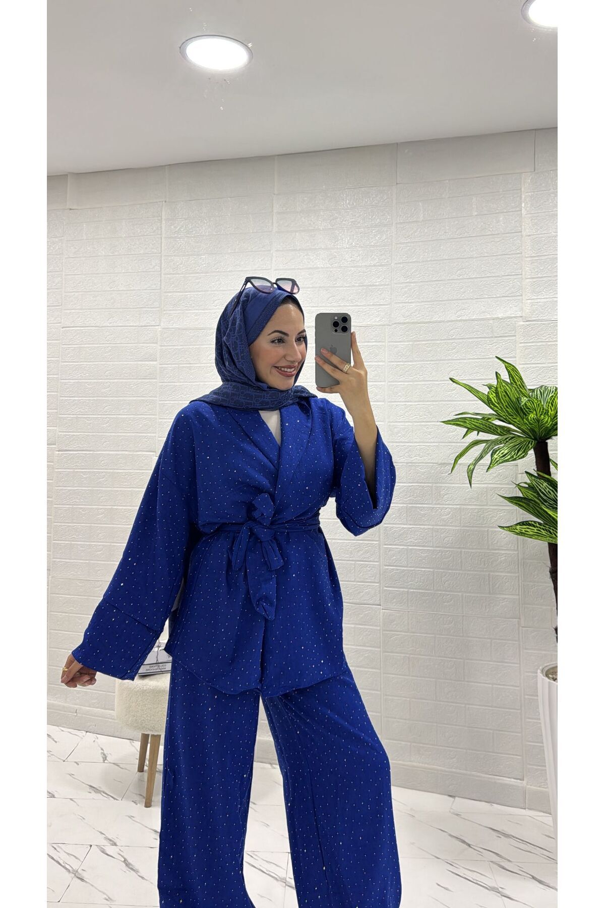 Taş Detaylı Bağcıklı Kimono Takım 51712 - LACİVERT Taş Detaylı Bağcıklı Kimono Takım 51712 - LACİVERT 496873-517126201261630 40-42