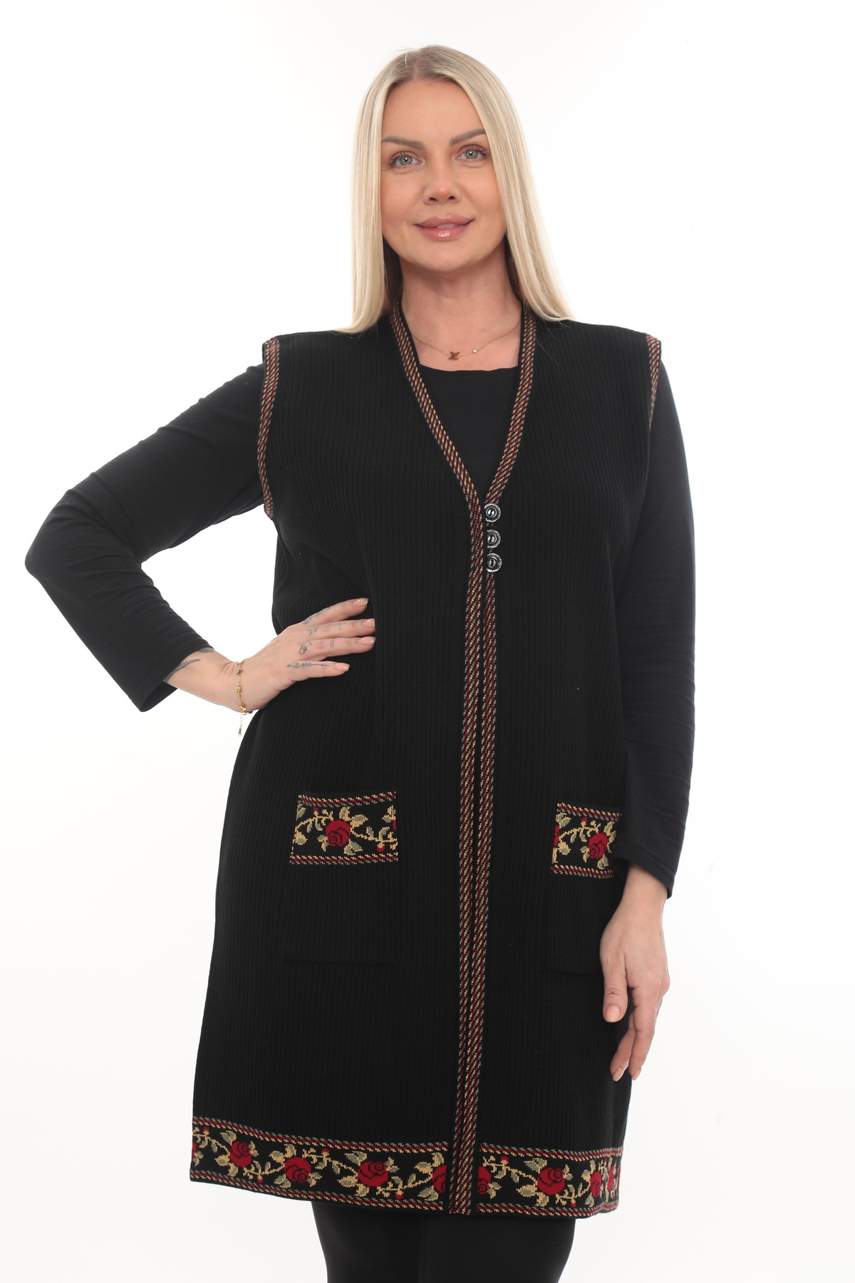 Siyah Güllü Nakışlı Kışlık Kalın Düğmeli Uzun Cepli Triko Anne Yelek Siyah Güllü Nakışlı Kışlık Kalın Düğmeli Uzun Cepli Triko Anne Yelek UZUNGÜLLÜ 2XL
