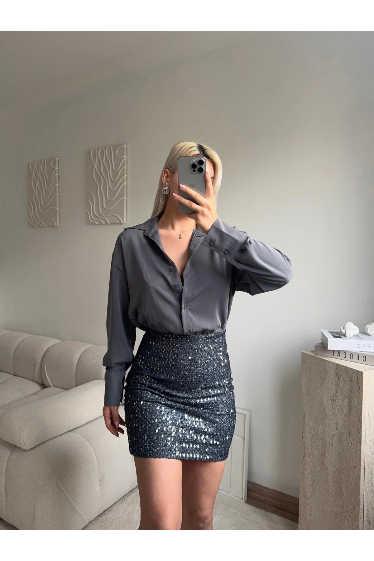 Pul Payet Etekli Gömlek Elbise - BEYAZ Pul Payet Etekli Gömlek Elbise - BEYAZ P4225S9319 L
